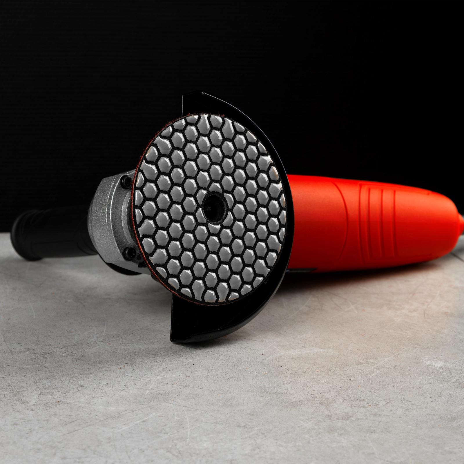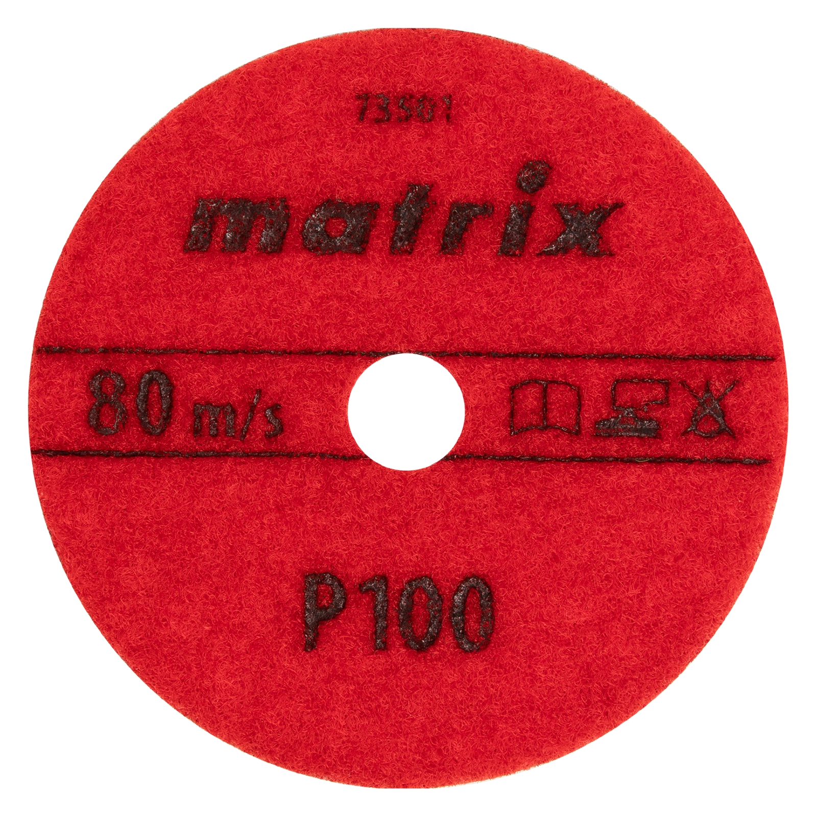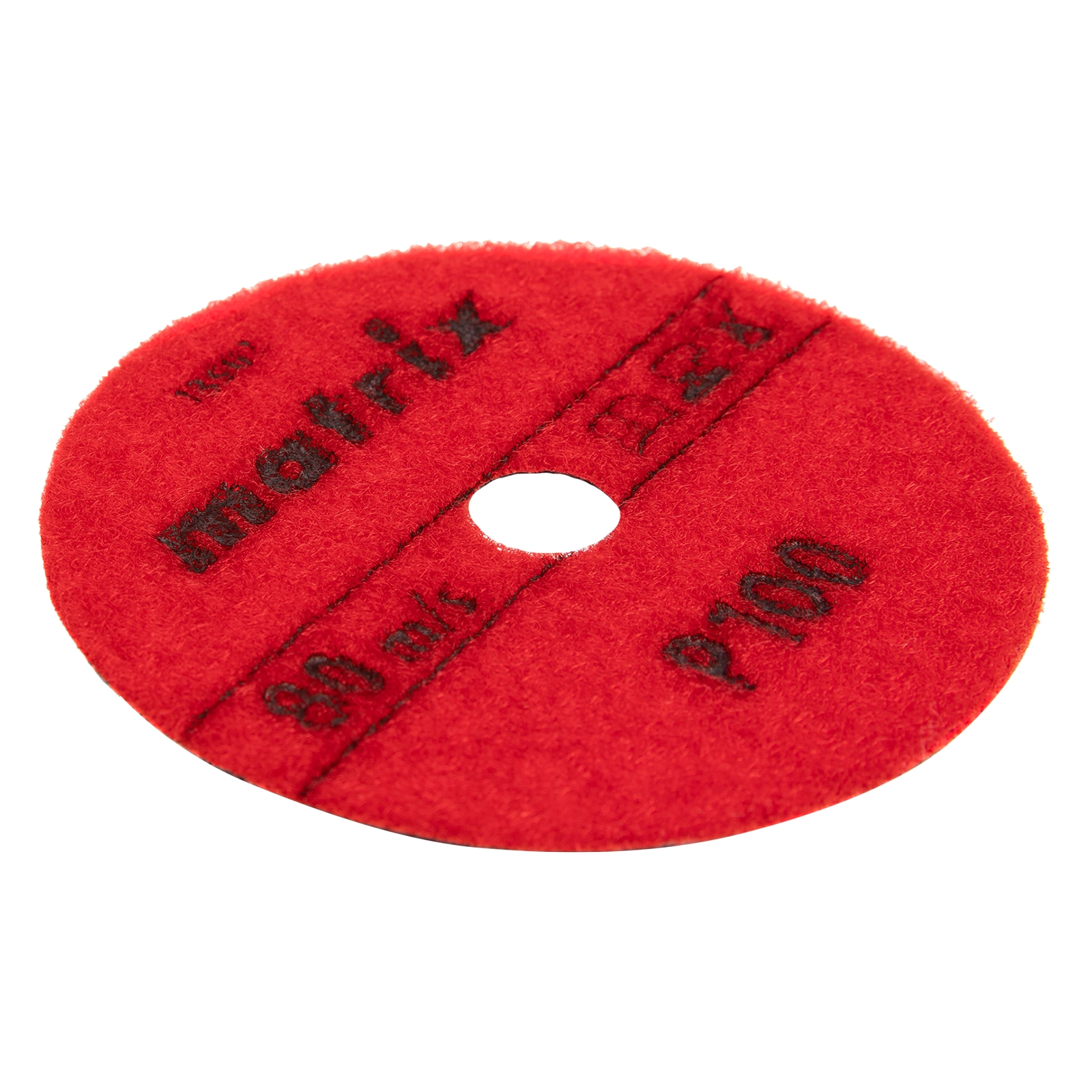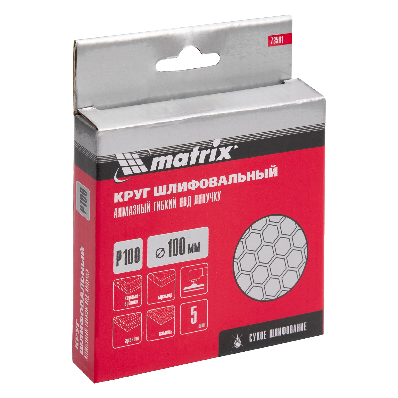 Алмазный гибкий шлифовальный круг Matrix 73501 диаметром 100 мм, с зернистостью P 100, 5 шт. в упаковке, предназначен для сухого шлифования преимущественно белых и цветных поверхностей из гранита, мрамора, природного и искусственного камня, керамогранита. Абразив с зернистостью P 100 снимает большой слой материала и используется для черновой шлифовки. Гибкость круга упрощает обработку предметов сложной формы. Круг используется на УШМ с установленной опорной тарелкой для АГШК.Производитель: ООО "Мир инструмента", Россия