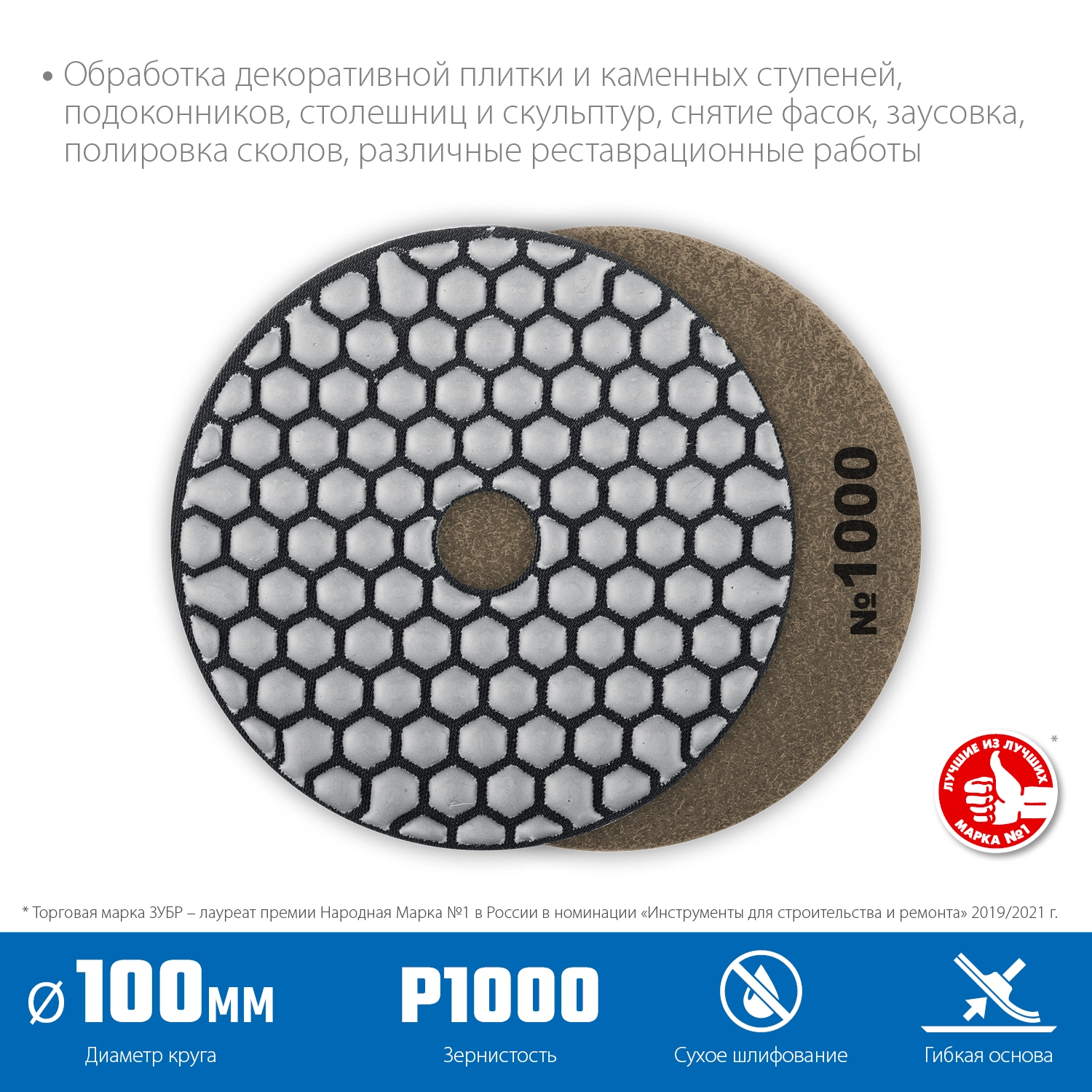 ПроизводителиКруг гибкий шлифовальный (черепашка) д=100мм №1000, сухое шлиф. (29868-1000) ЗУБР