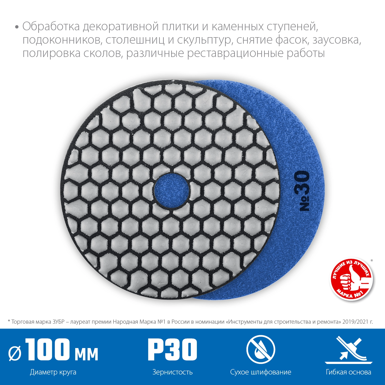ПроизводителиКруг гибкий шлифовальный (черепашка) д=100мм №30, сухое шлиф. (29868-030) ЗУБР