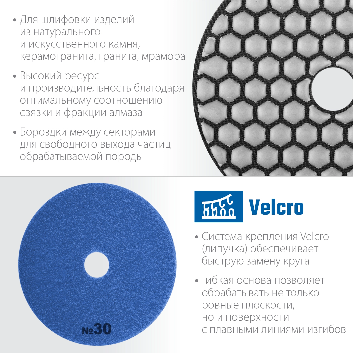 Для сухой шлифовки и полировки изделий из натурального и искуственного камня, керамогранита, гранита, мрамора. Используется на ручном электроинструменте (УШМ, полировальные машины, дрели) с насадкой адаптером под липучку Velcro. Охлаждение водой повышает ресурс инструмента.