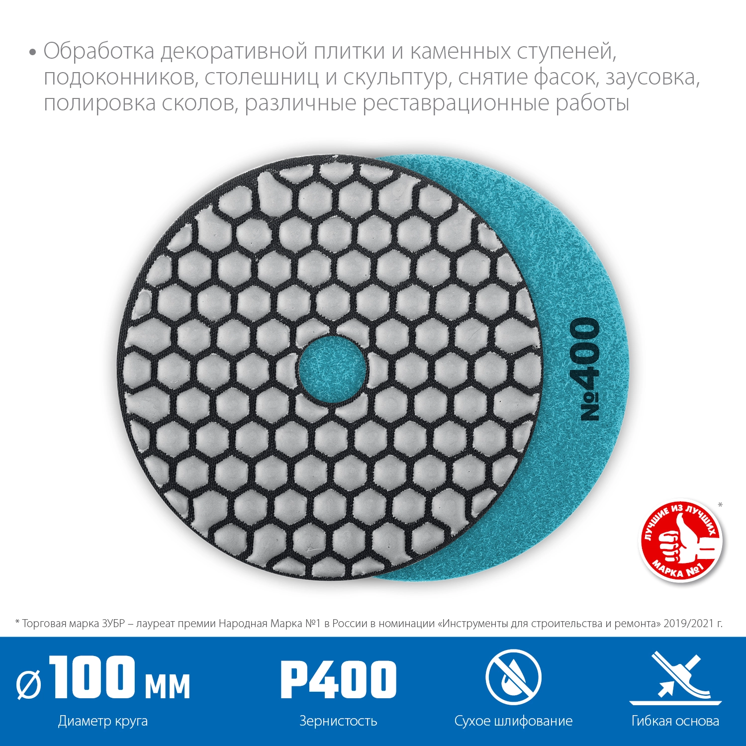 ПроизводителиКруг гибкий шлифовальный (черепашка) д=100мм №400, сухое шлиф. (29868-400) ЗУБР