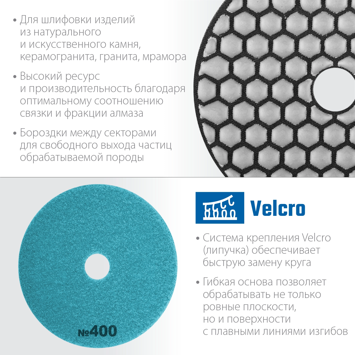 Для сухой шлифовки и полировки изделий из натурального и искуственного камня, керамогранита, гранита, мрамора. Используется на ручном электроинструменте (УШМ, полировальные машины, дрели) с насадкой адаптером под липучку Velcro. Охлаждение водой повышает ресурс инструмента.