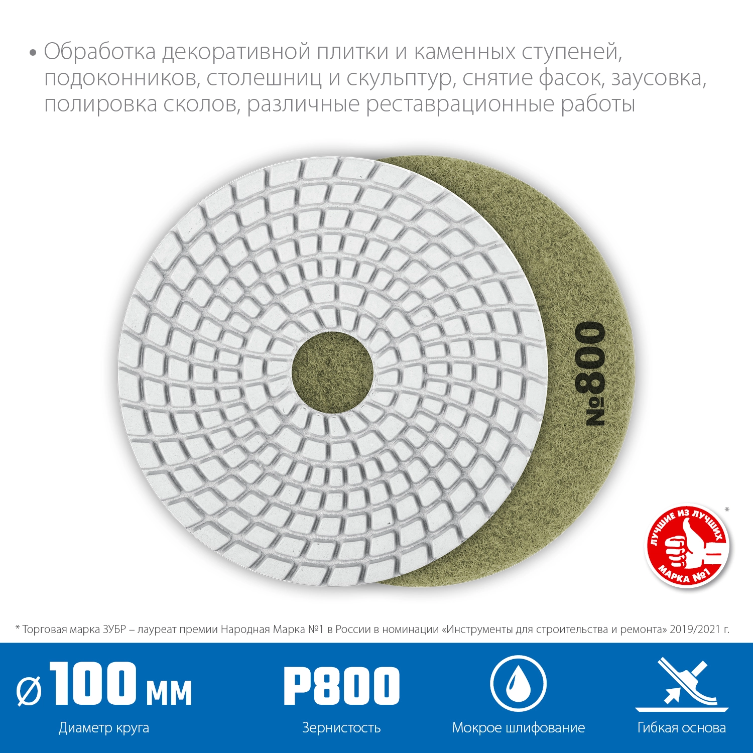 ПроизводителиКруг гибкий шлифовальный (черепашка) д=100мм №800, мокрое шлиф. (29866-800) ЗУБР