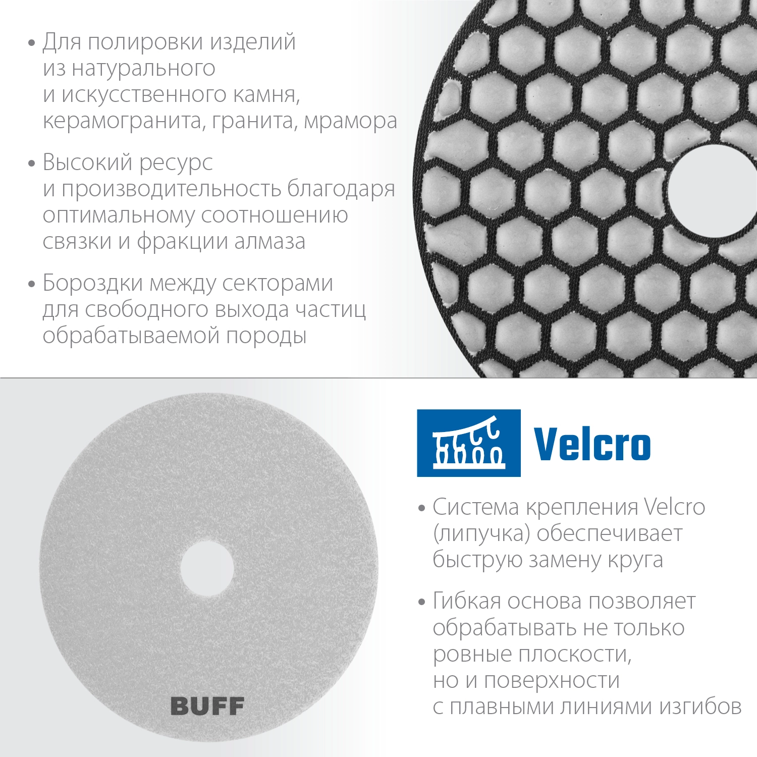 Для сухой шлифовки и полировки изделий из натурального и искуственного камня, керамогранита, гранита, мрамора. Используется на ручном электроинструменте (УШМ, полировальные машины, дрели) с насадкой адаптером под липучку Velcro. Охлаждение водой повышает ресурс инструмента.