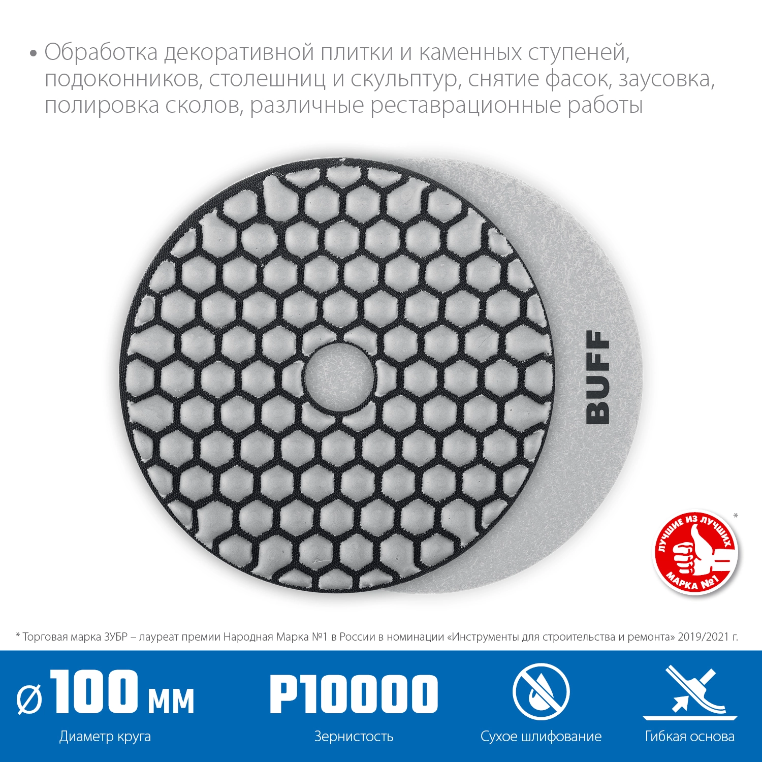 ПроизводителиКруг гибкий шлифовальный (черепашка) д=100мм BUFF №10000, сухое шлиф. (29868-10000) ЗУБР