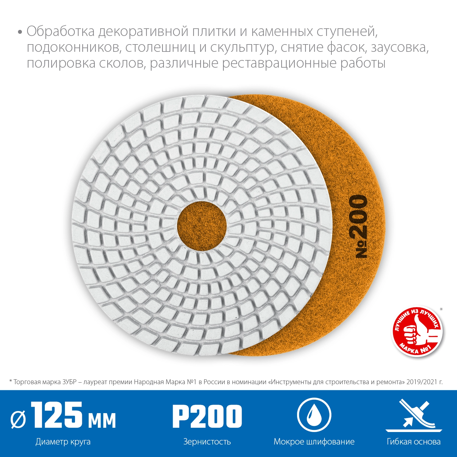 ПроизводителиКруг гибкий шлифовальный (черепашка) д=125мм №200, мокрое шлиф. (29867-200) ЗУБР