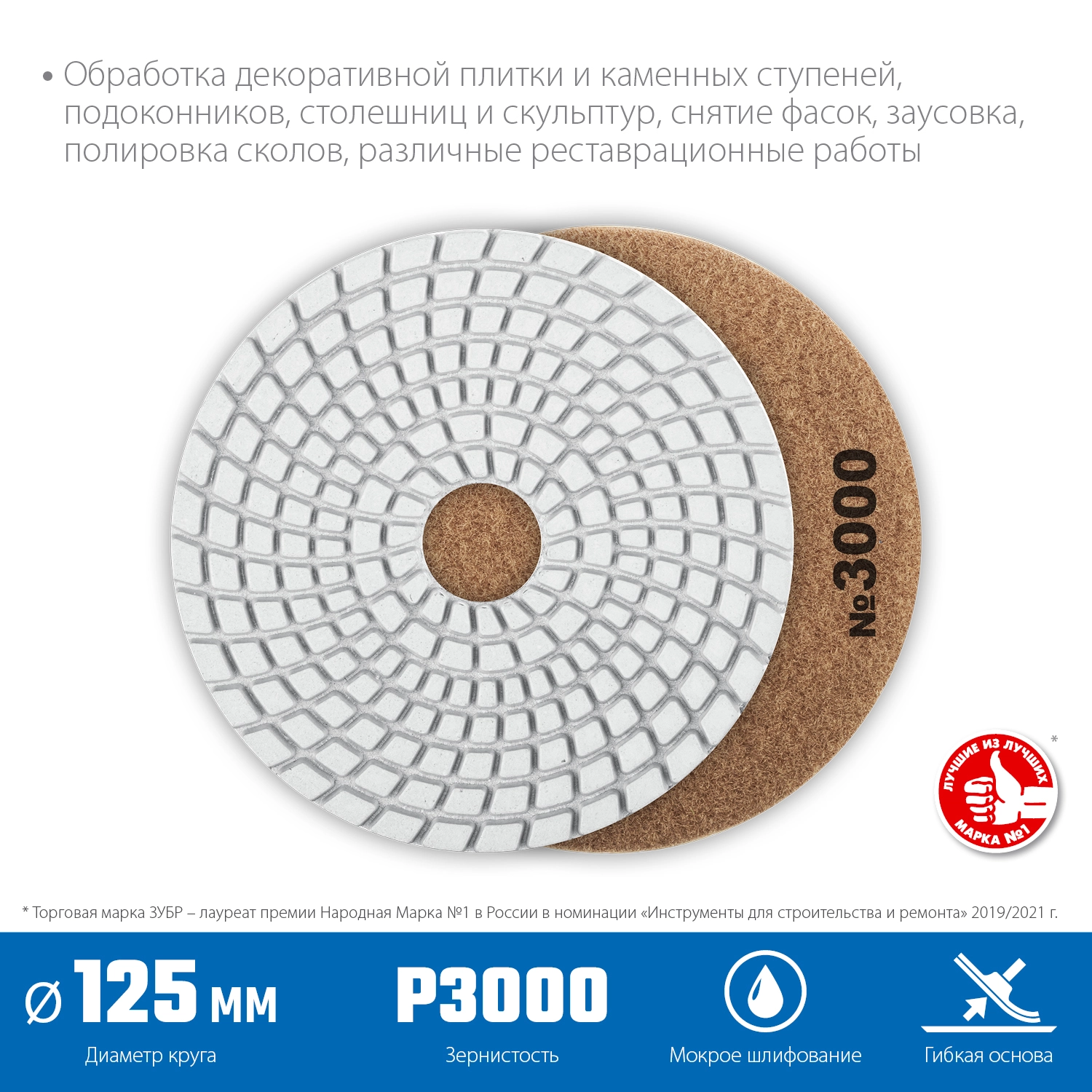ПроизводителиКруг гибкий шлифовальный (черепашка) д=125мм №3000, мокрое шлиф. (29867-3000) ЗУБР