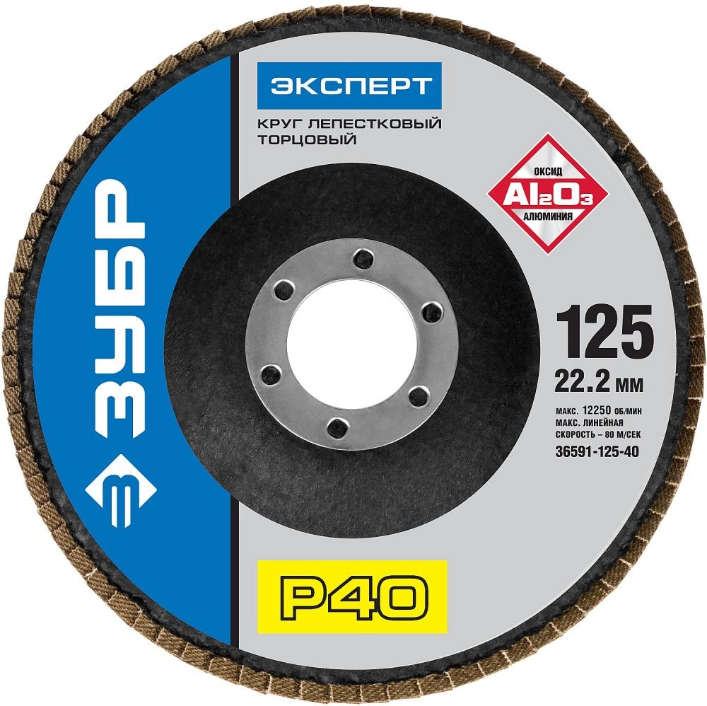 ПроизводителиКруг лепестковый 125х22.23 мм для металла, P40, тип КЛТ1 (36591-125-40) ЗУБР