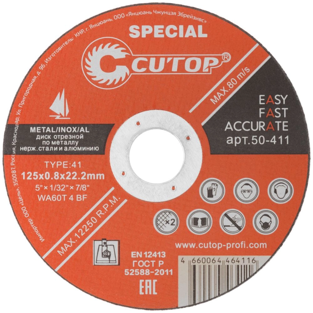 ПроизводителиКруг отрезной 125х0.8х22.23 мм для металла, нерж. стали и алюминия SPECIAL (50-411) CUTOP