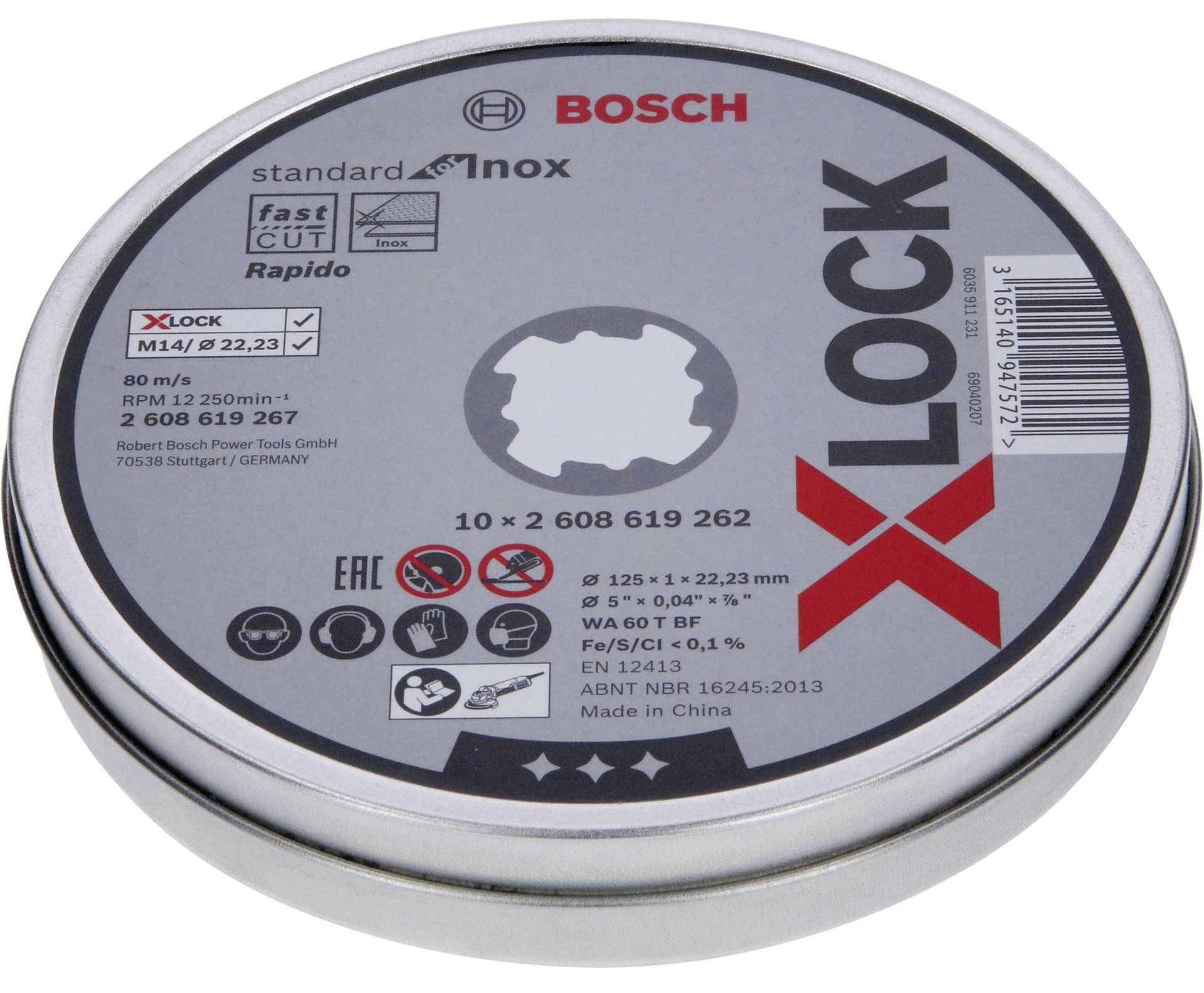 ЭКСПЕРТУровень качества. При классификации продуктов, имеющих схожее наименование, но обладающие различными потребительскими свойствами мы приняли следующий Вес факторов: 80% - подтвержденный ресурс, 15% - заявленная производительность/скорость, 5% - субъективные ощущения потребителя. ПодробнееКод товара: 0014937(1)Диск предназначен для резки нержавеющей и углеродной стали угловой шлифмашинкой. Быстрые и чистые резы без образования заусенцев и изменения цвета заготовки.ХарактеристикиАртикул 2.608.619.267/шт.Бренды BoschСтрана производства КитайТип изделия ОтрезнойПосадочный диаметр 22,23Толщина круга 1Диаметр диска 125X-Lock да- Отрезной диск X-LOCK Standard for Inox обеспечивает надежную работу по нержавеющей стали.