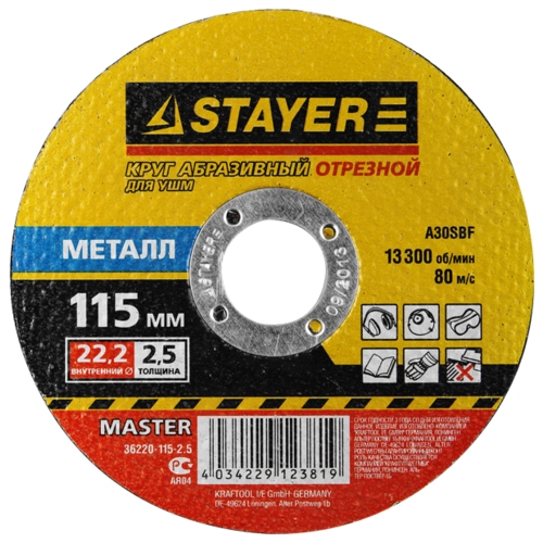 ПроизводителиКруг отрезной 115х2.5х22.23 мм для металла "MASTER" (36220-115-2.5_z01_G) STAYER