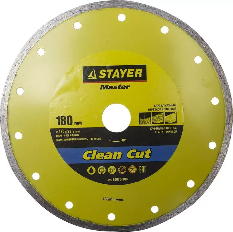 СТАНДАРТУровень качества. При классификации продуктов, имеющих схожее наименование, но обладающие различными потребительскими свойствами мы приняли следующий Вес факторов: 80% - подтвержденный ресурс, 15% - заявленная производительность/скорость, 5% - субъективные ощущения потребителя. ПодробнееКод товара: 0025692Неоспоримым преимуществом отрезных алмазных кругов STAYER серии MASTER является их высокая производительность, увеличенный рабочий ресурс и универсальность применения при обработке различных строительных материалов. Применяются на УШМ для резки керамогранита, мрамора при обязательном водяном охлаждении.ХарактеристикиАртикул 36675-180Бренды StayerСтрана производства КитайТип изделия СплошнойПосадочный диаметр 22,23Алмазный слой, мм 5Диаметр диска 180Вес 0.348Неоспоримым преимуществом отрезных алмазных дисков STAYER серии MASTER является их высокая производительность, увеличенный рабочий ресурс и универсальность применения при обработке различных строительных материалов. Применяются на УШМ для резки керамогранита, мрамора при обязательном водяном охлаждении.