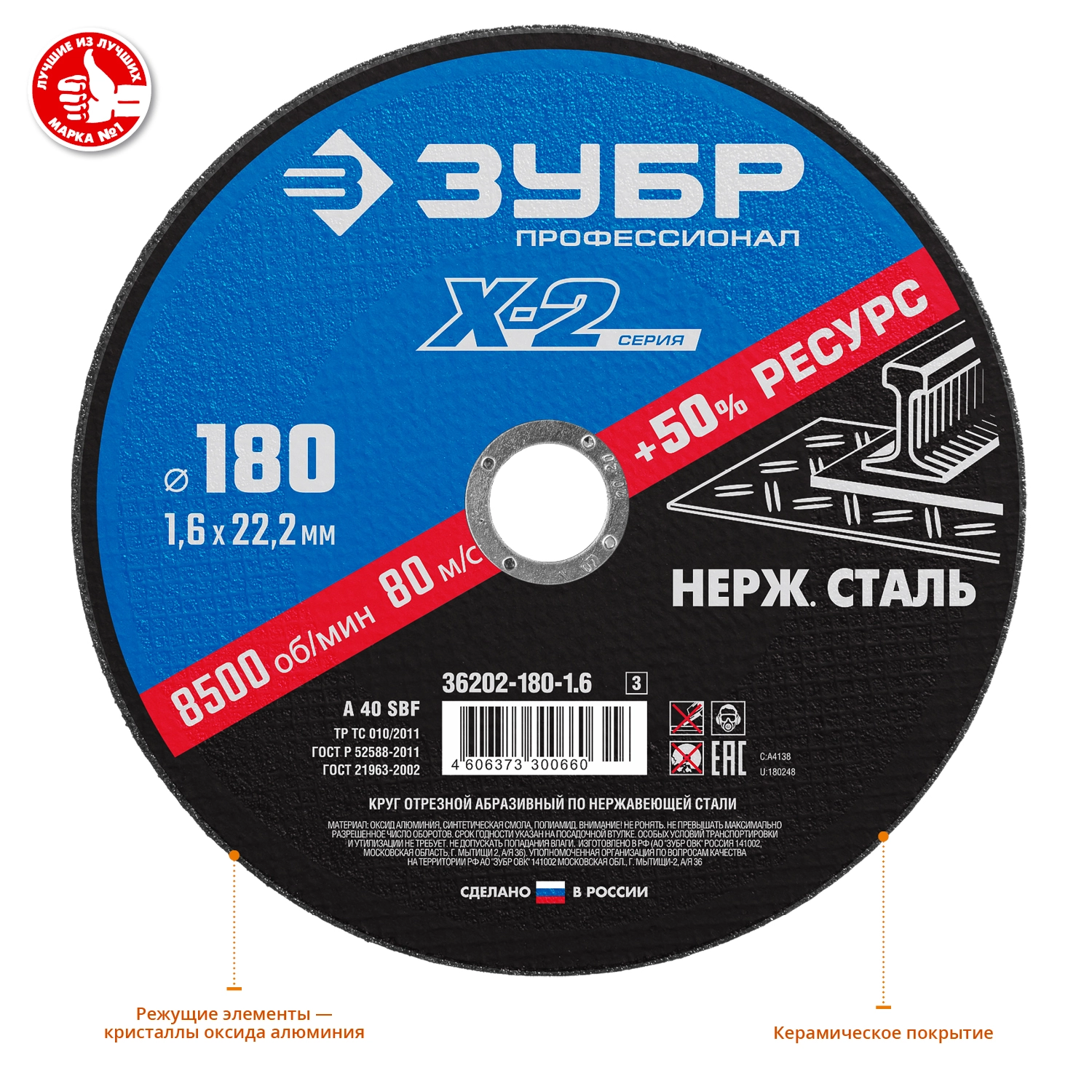 ПроизводителиКруг отрезной 180х1.6х22.23 мм для нерж. стали "X-2" (36202-180-1.6_z03) ЗУБР