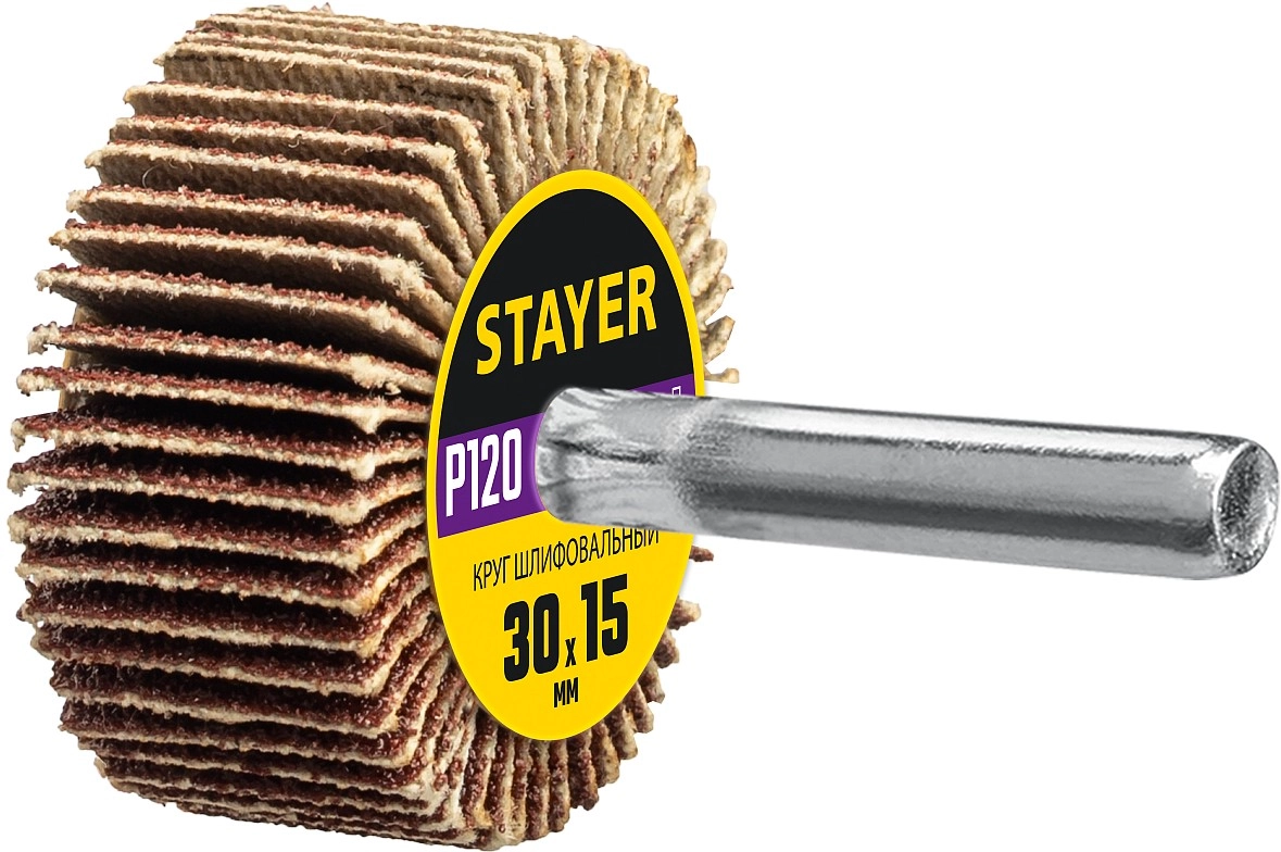ПроизводителиКруг шлифовальный лепестковый d 30х15мм, P120, на шпильке d 6мм (36606-120) STAYER