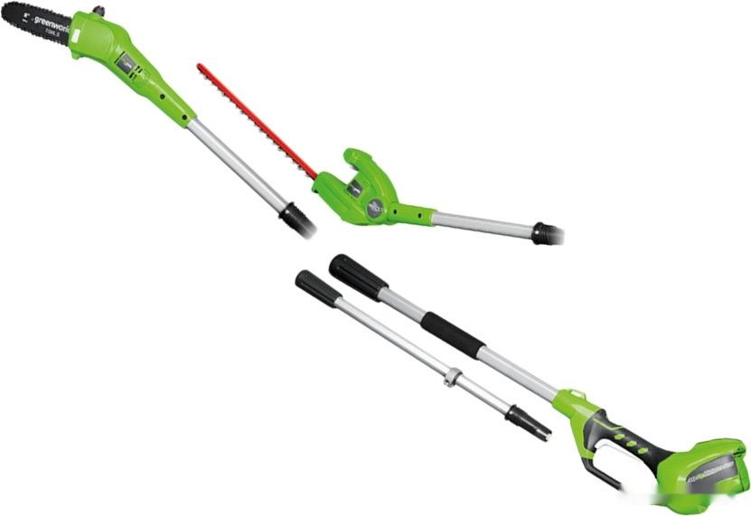 ПроизводителиКусторез аккумуляторный G40PSH (40.0 В, без АКБ и ЗУ, штанга 1.7м)(1303907) GreenWorks