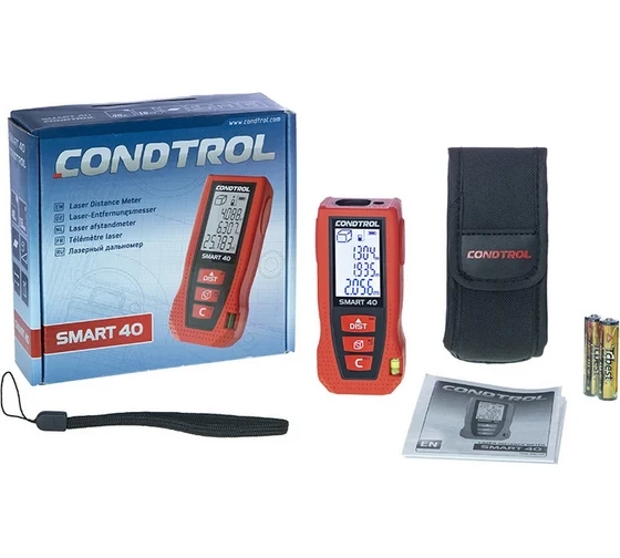 CONDTROL SMART 40 – лазерная рулетка, обладающая ударопрочным корпусом и оптикой нового поколения, благодаря которой можно работать в любых условиях освещения. CONDTROL SMART 40 позволяет проводить замеры как на улице, так и в помещениях на расстоянии до 40 м.Ударопрочный корпус