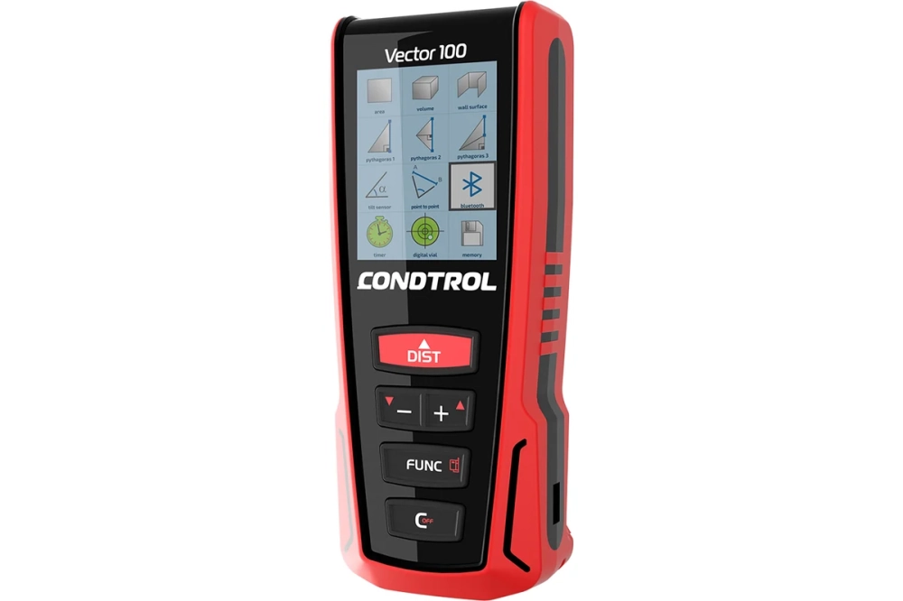 CONDTROL Vector 100 – профессиональный лазерный дальномер, предназначенный для быстрого и точного измерения расстояния до 100 м. Полноцветный дисплей с высоким разрешением обеспечивает комфортную работу при любых условиях освещения. Встроенный 3D-акселерометр поможет определить расстояние между двумя произвольными точками в пространстве, а функция Bluetooth вместе с приложением CONDTROL Smart Measure значительно увеличит возможности использования лазерной рулетки.