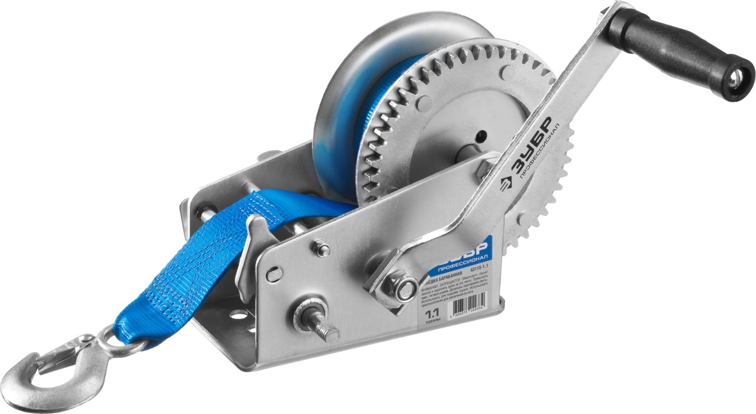 ПроизводителиЛебедка ручная барабанная "ПРОФЕССИОНАЛ", тяговая, ленточная, 1,1т, 10м (43115-1.1) ЗУБР