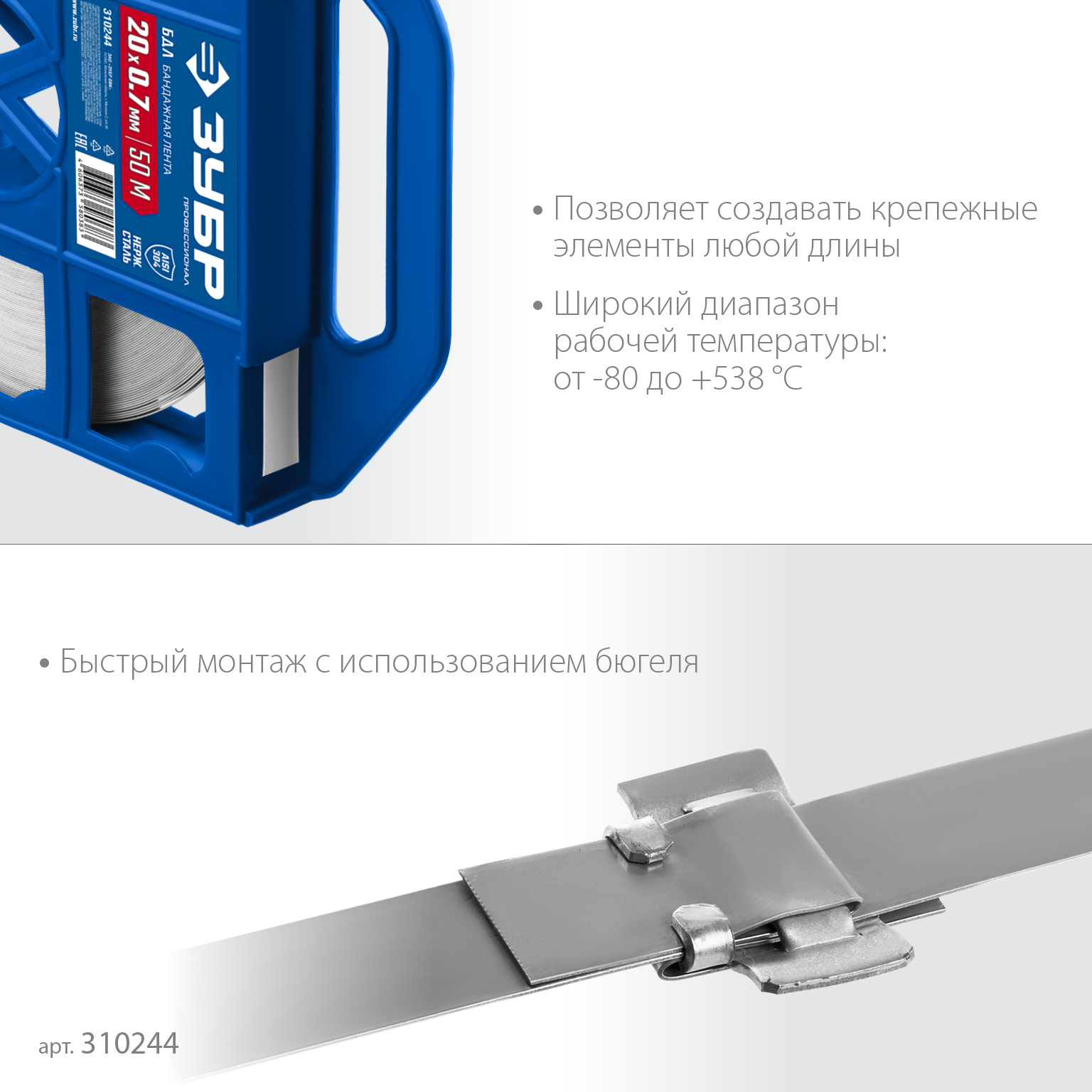 Бренд: ЗУБРБандажная лента представляет собой простой и универсальный вид крепежа. Используется для крепления указателей, знаков, вывесок и т.д.. Правильно подобранная лента обеспечит простоту монтажа и надежность крепления. Для монтажа бандажной лентой используются специальные крепления - бюгели.