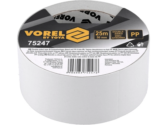 ПроизводителиЛента клейкая двухсторонняя на полипропиленовой основе 50ммх25м (75247) VOREL