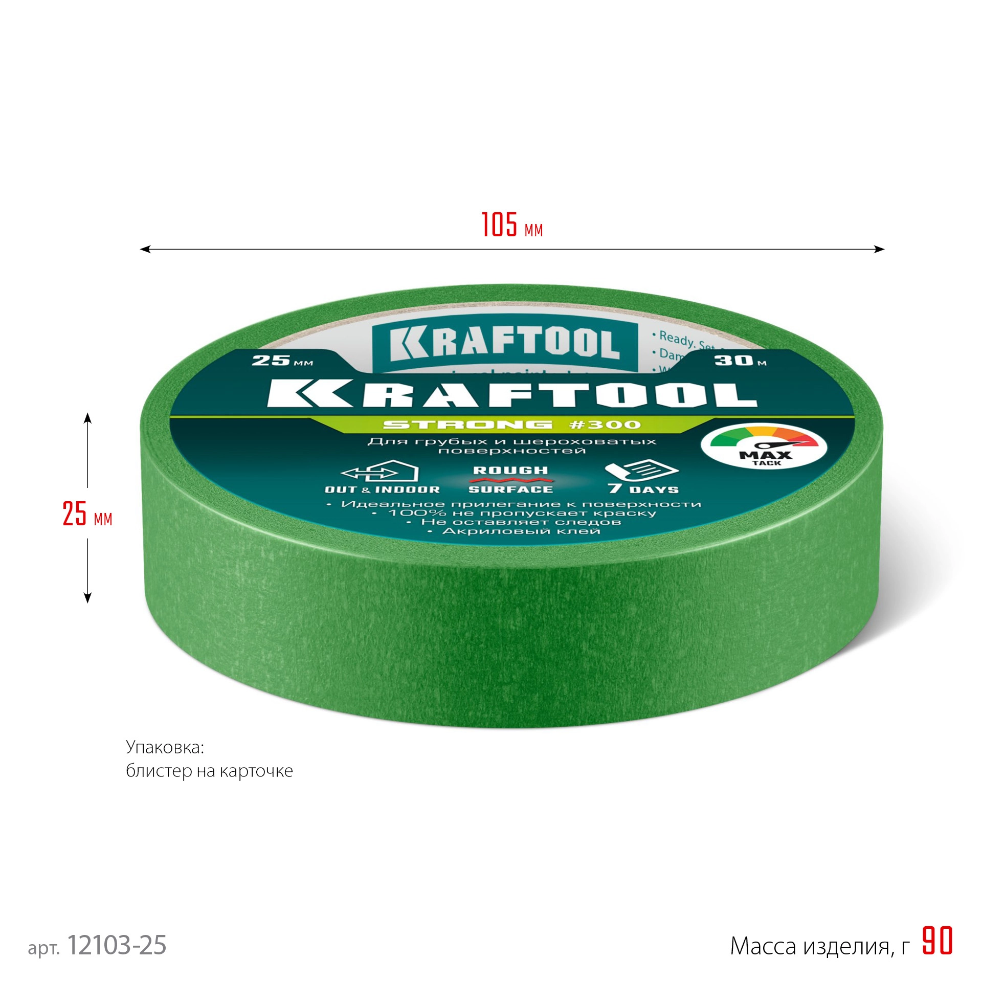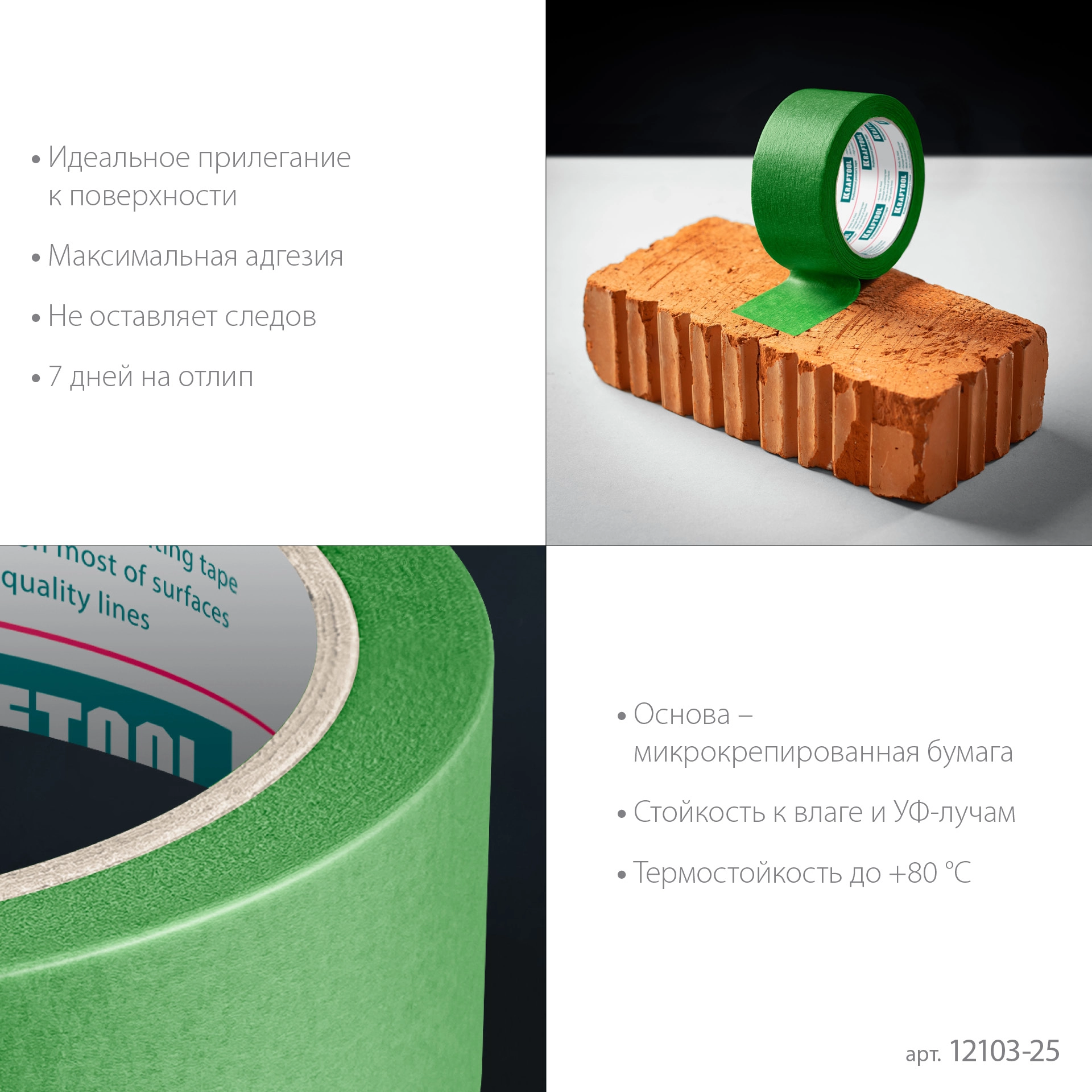 ПроизводителиЛента малярная бумажная 25мм/30м, для грубых и шероховатых поверхностей, зеленая (12103-25) KRAFTOOL