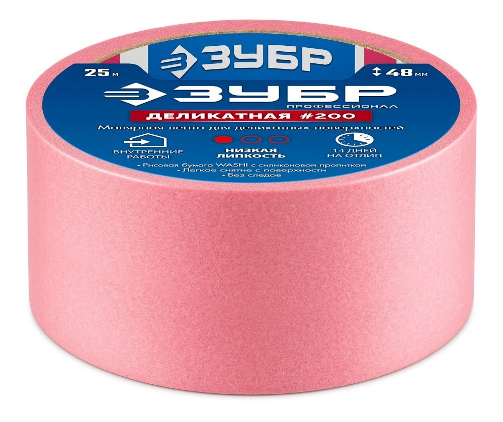 ПроизводителиЛента малярная бумажная 48мм/25м,для деликатных и недавно окрашенных поверхн.,розов. (12142-48) ЗУБР