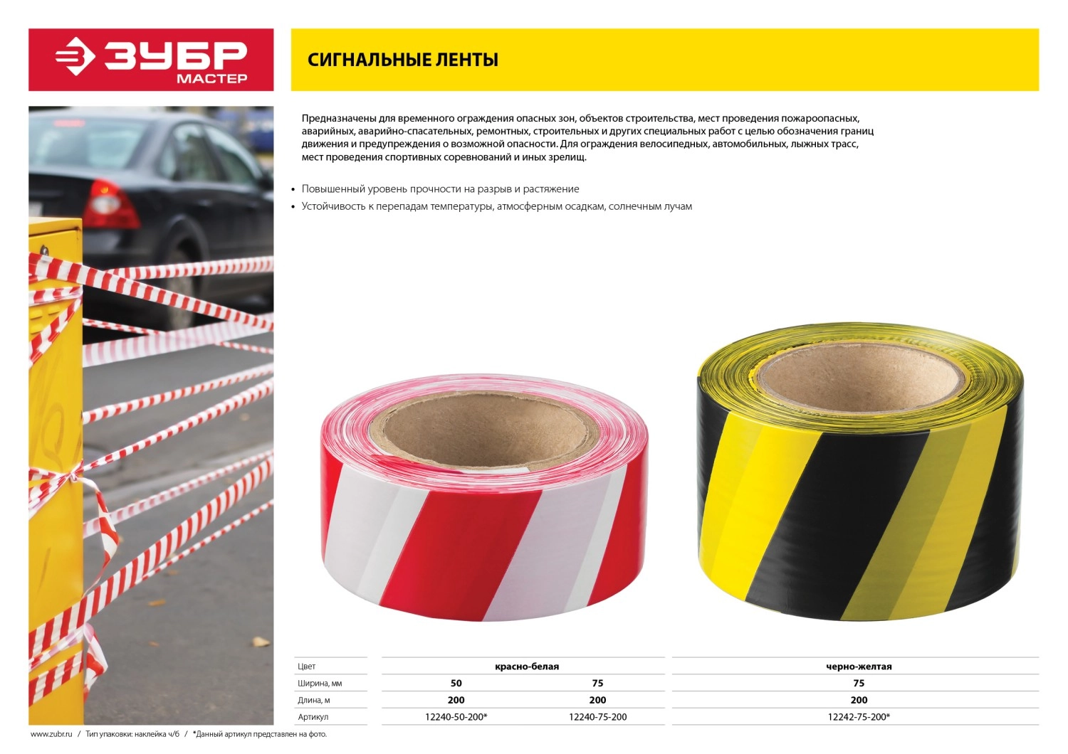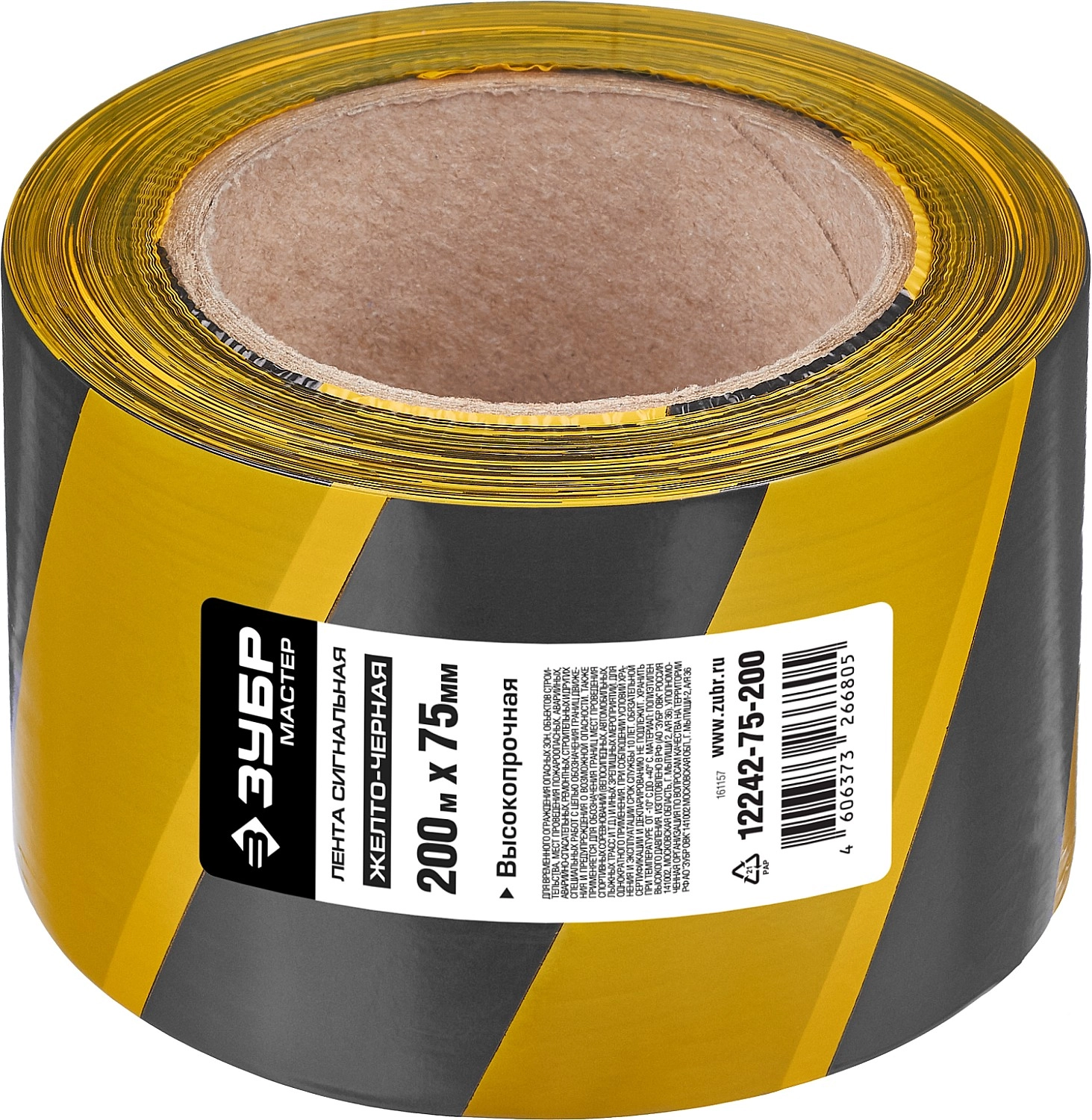 ПроизводителиЛента сигнальная 75мм/200м, черно-желтая (12242-75-200) ЗУБР