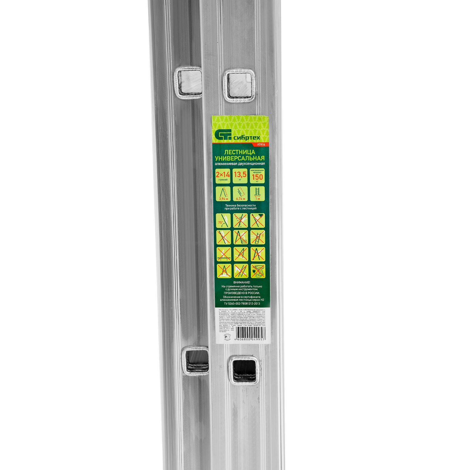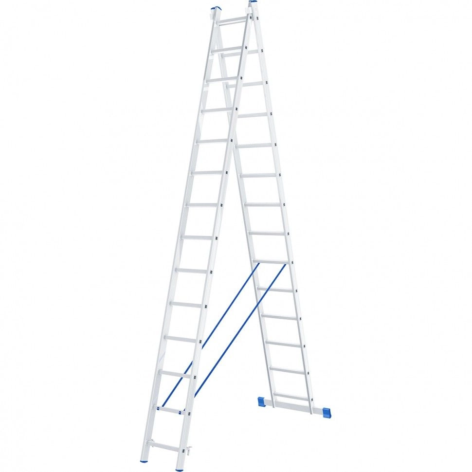 Алюминиевая двухсекционная лестница Сибртех 97914 состоит из 2-х секций по 14 ступеней каждая.