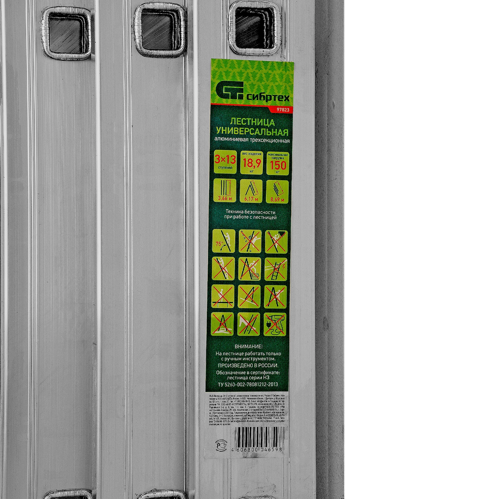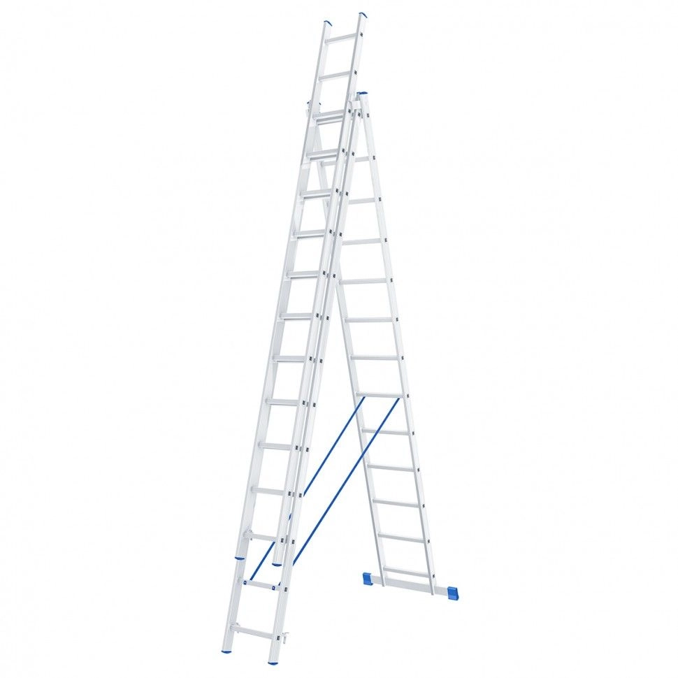 Алюминиевая трехсекционная лестница Сибртех 97823 состоит из 3-х секций по 13 ступеней каждая.