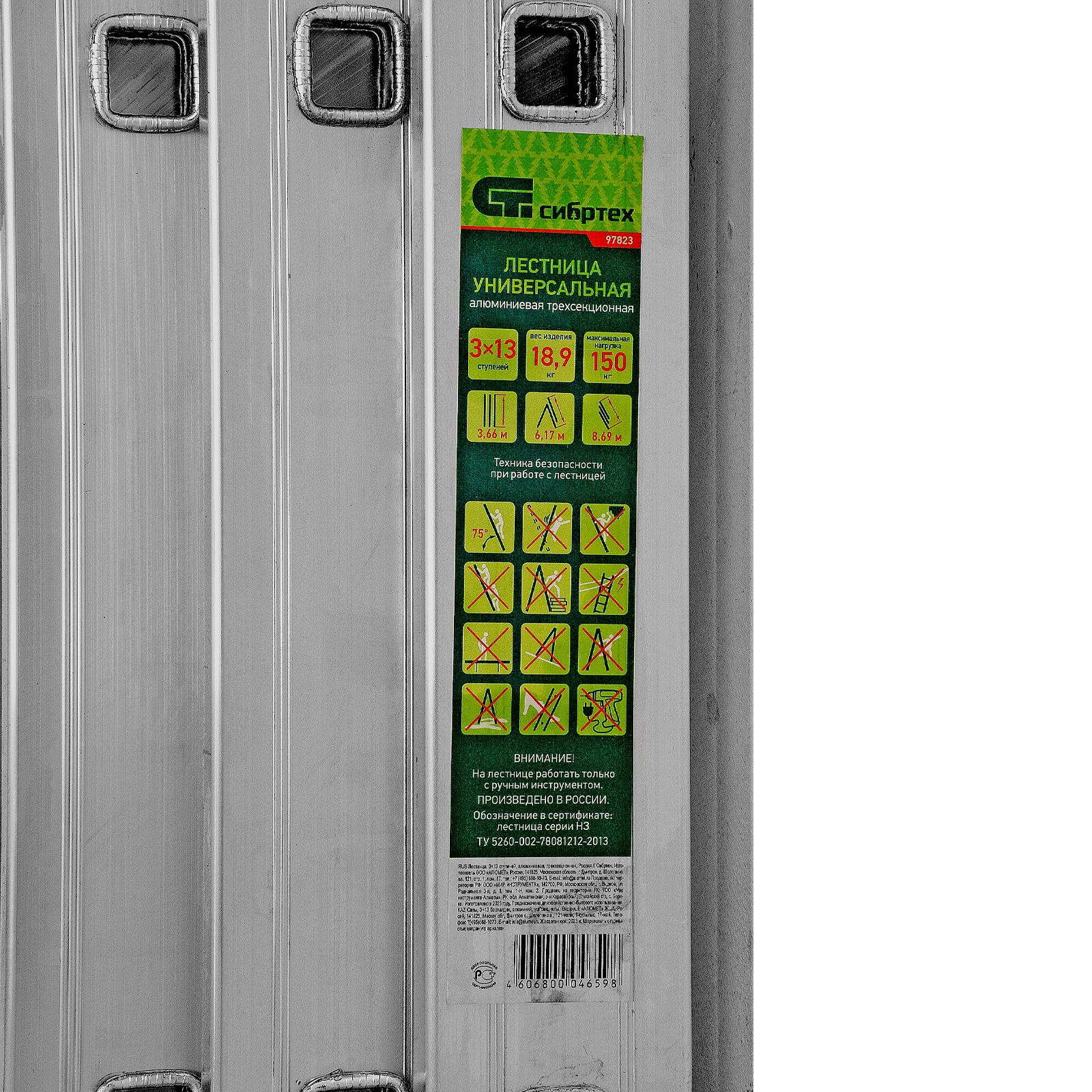 Алюминиевая трехсекционная лестница Сибртех 97823 состоит из 3-х секций по 13 ступеней каждая.