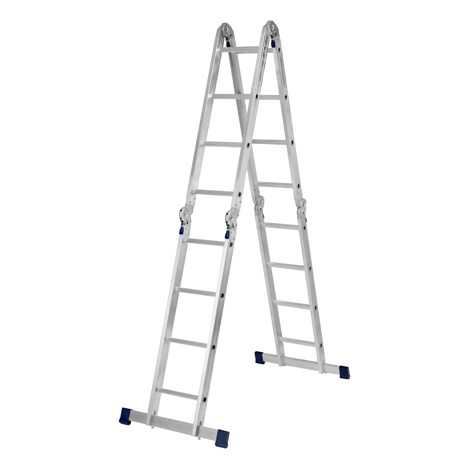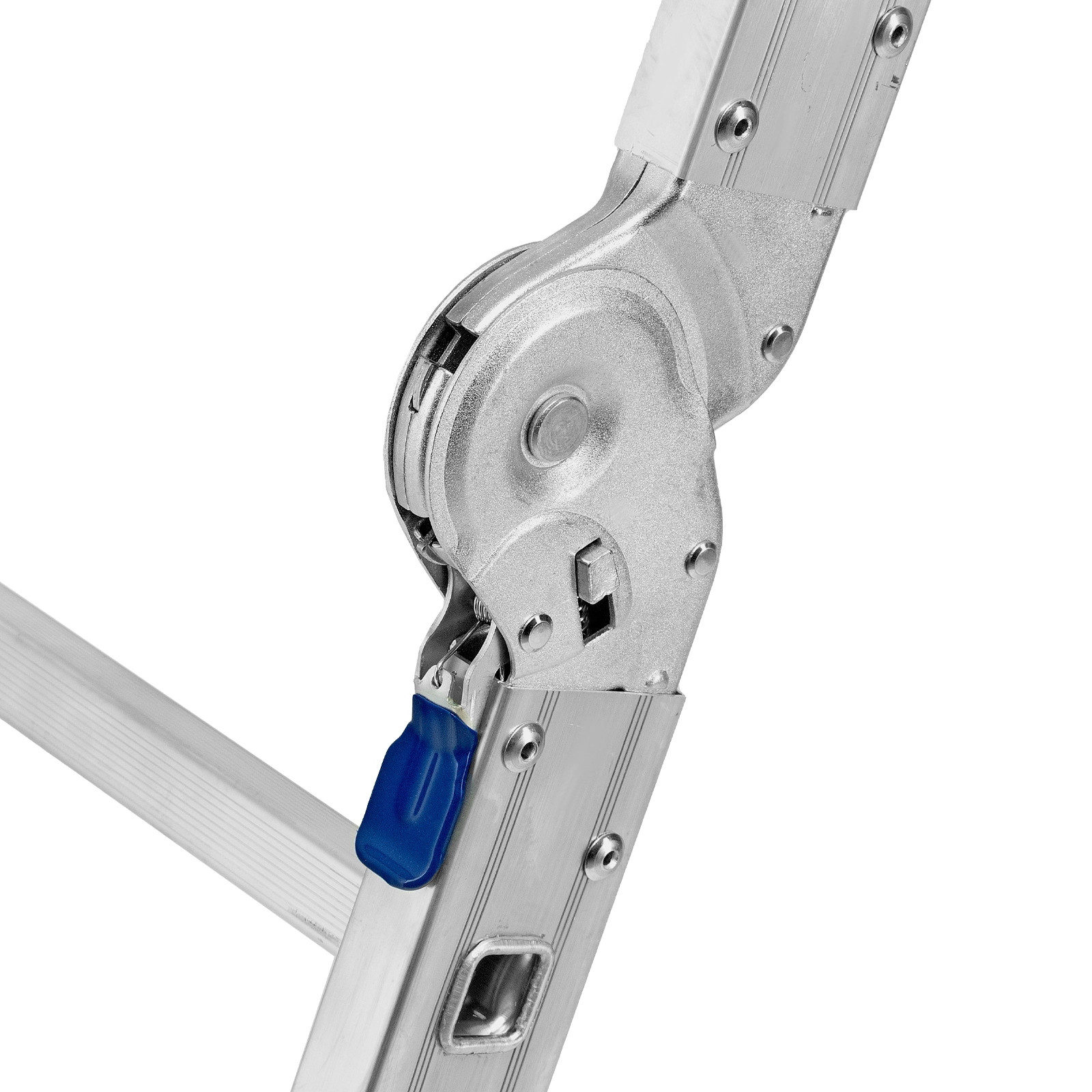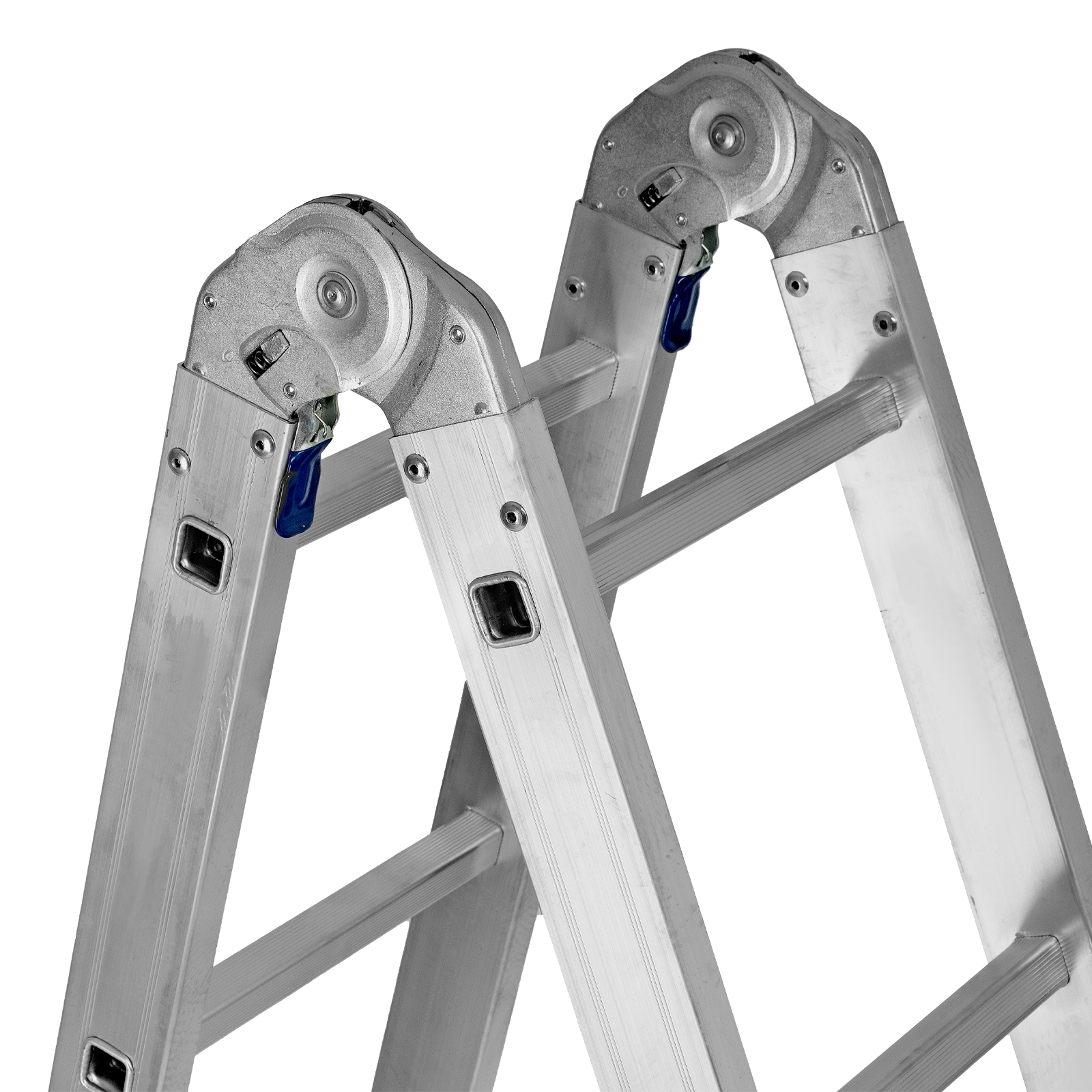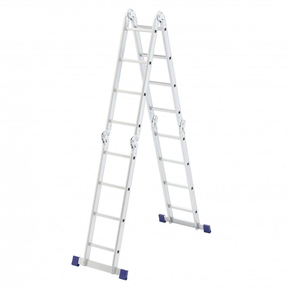 Шарнирная алюминиевая лестница Сибртех 97882 представляет собой 4 секции по 4 ступени, которые можно настроить в нескольких рабочих положениях.