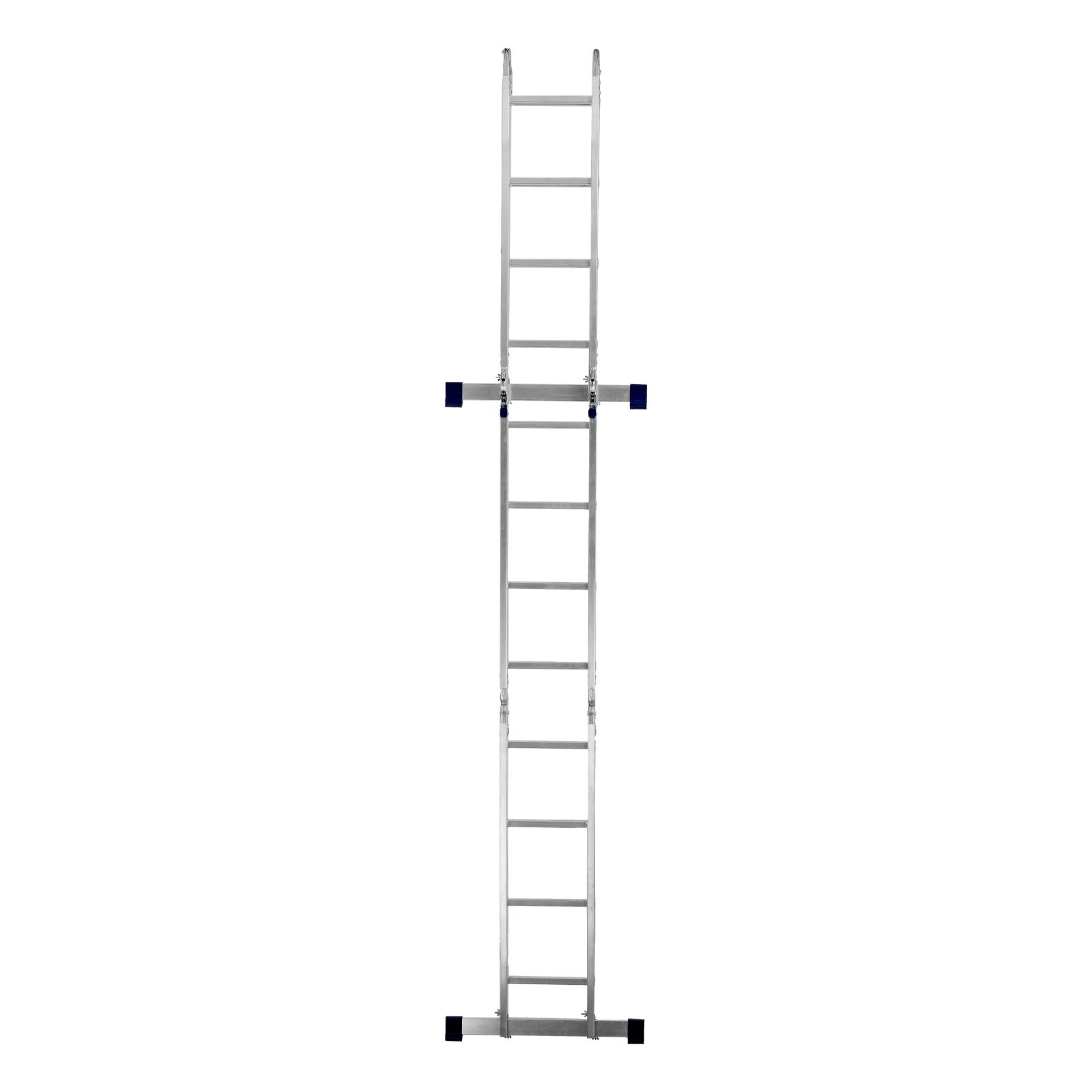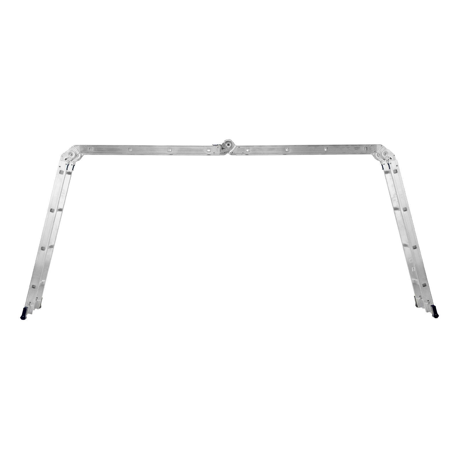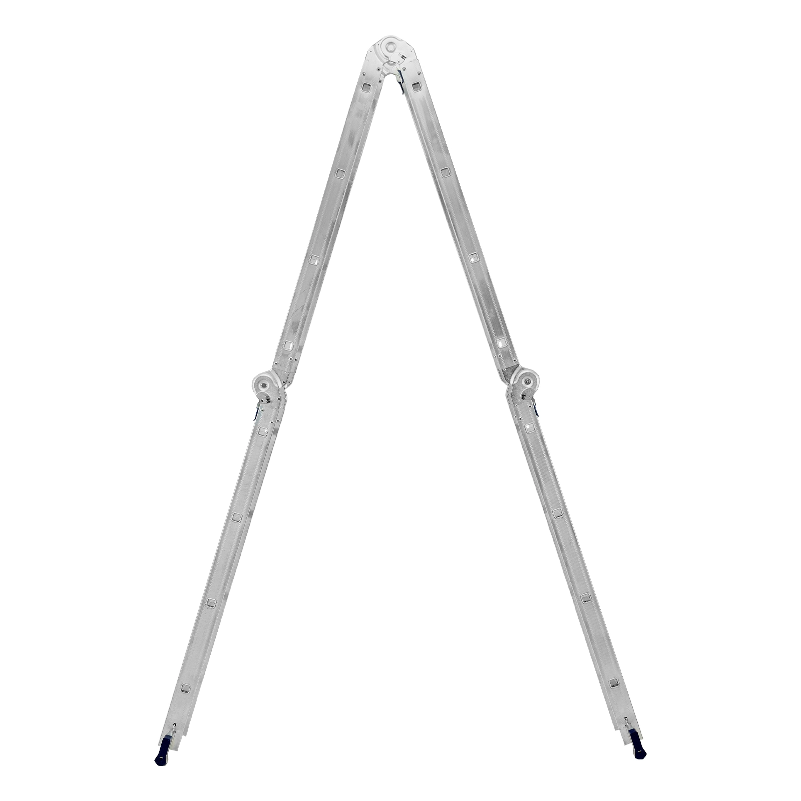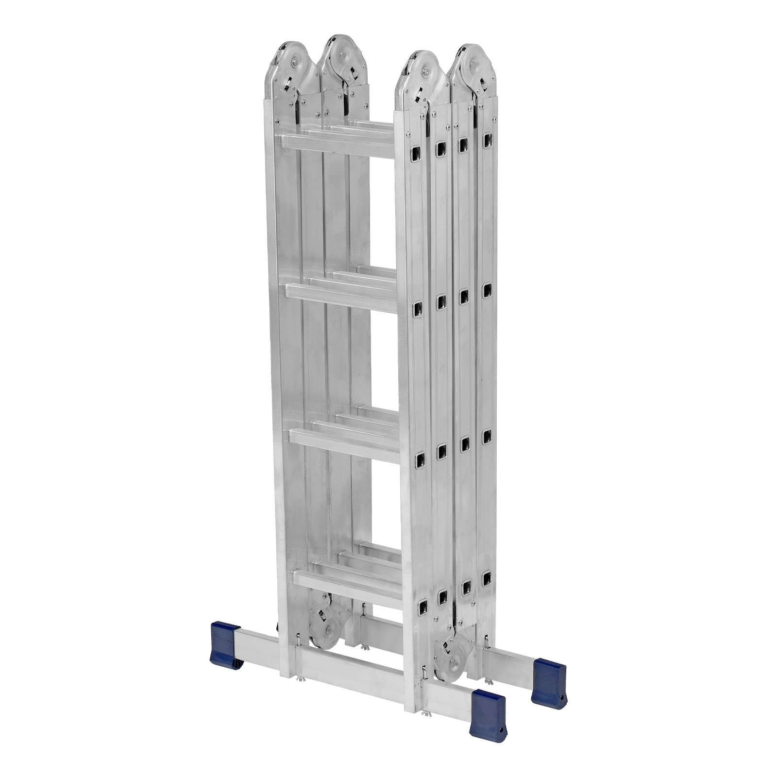 Шарнирная алюминиевая лестница Сибртех 97882 представляет собой 4 секции по 4 ступени, которые можно настроить в нескольких рабочих положениях.