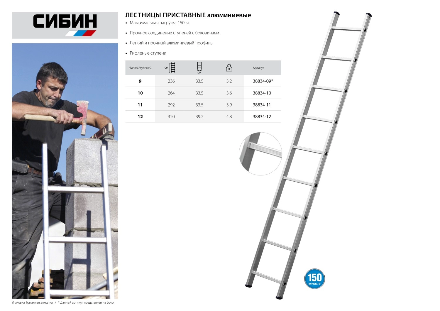 ПроизводителиЛестница приставная, 12 ступеней, высота 335 см (38834-12) СИБИН