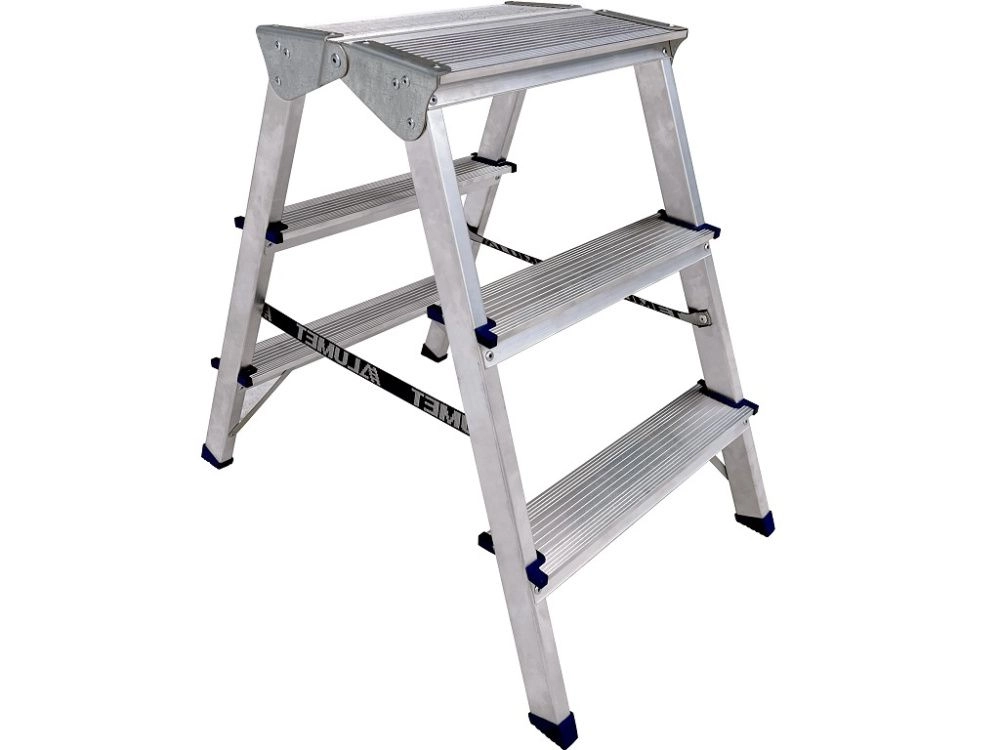 ПроизводителиЛестница-стремянка алюм. двухстор. с шир. верх. ступенью ADK (3 ступ. 60/69см 2,9 кг) АЛЮМЕТ