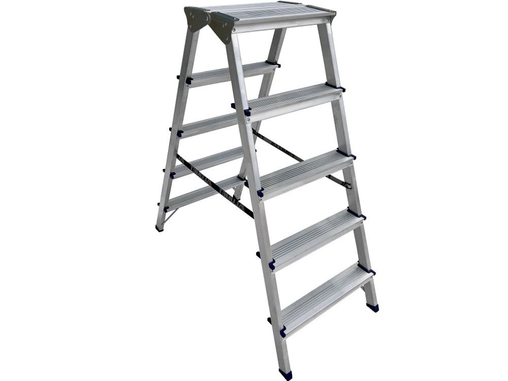 ПроизводителиЛестница-стремянка алюм. двухстор. с шир. верх. ступенью ADK (5 ступ. 103/116см 4,6 кг) АЛЮМЕТ