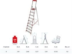 СТАНДАРТУровень качества. При классификации продуктов, имеющих схожее наименование, но обладающие различными потребительскими свойствами мы приняли следующий Вес факторов: 80% - подтвержденный ресурс, 15% - заявленная производительность/скорость, 5% - субъективные ощущения потребителя. ПодробнееКод товара: 0072086(0)ХарактеристикиАртикул 5150109Бренды Новая высотаСтрана производства РоссияВысота до площадки, м 1.91Высота общая, м 2.68Высота рабочая, м 3.91Макс. нагрузка, кг 225Количество ступеней 9Количество ступеней: 9. Высота площадки: 1,91 м. Рабочая высота: 3,91 м. Ширина: 0,57 м. Нагруз: 225кг. Вес: 9,2 кг. Рифлёная поверхность ступеней, дуга безопасности 600 мм, прочные страховочные ремни. ОрганайзерПроизводитель: ООО «Завод высотных конструкций» 188301, Ленинградская область, Гатчинский район, промышленная зона Корпиково, дом 2, помещение 108.