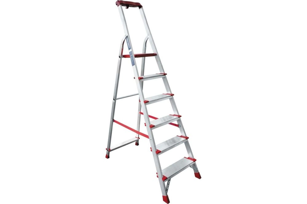 Профессиональная стремянка Новая Высота NV3118, 1x6 ступеней 130 мм, органайзер 3118106 предназначена для интенсивного использования.