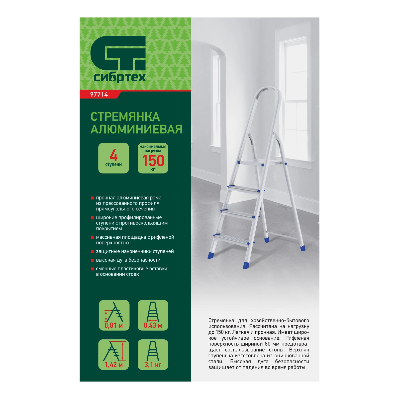 ХарактеристикиАртикул 97714Бренды СИБРТЕХСтрана производства РоссияВысота до площадки, м 0.815Высота рабочая, м 2.815Макс. нагрузка, кг 150Количество ступеней 4Прочная алюминиевая рама из прессованного профиля прямоугольного сечения.