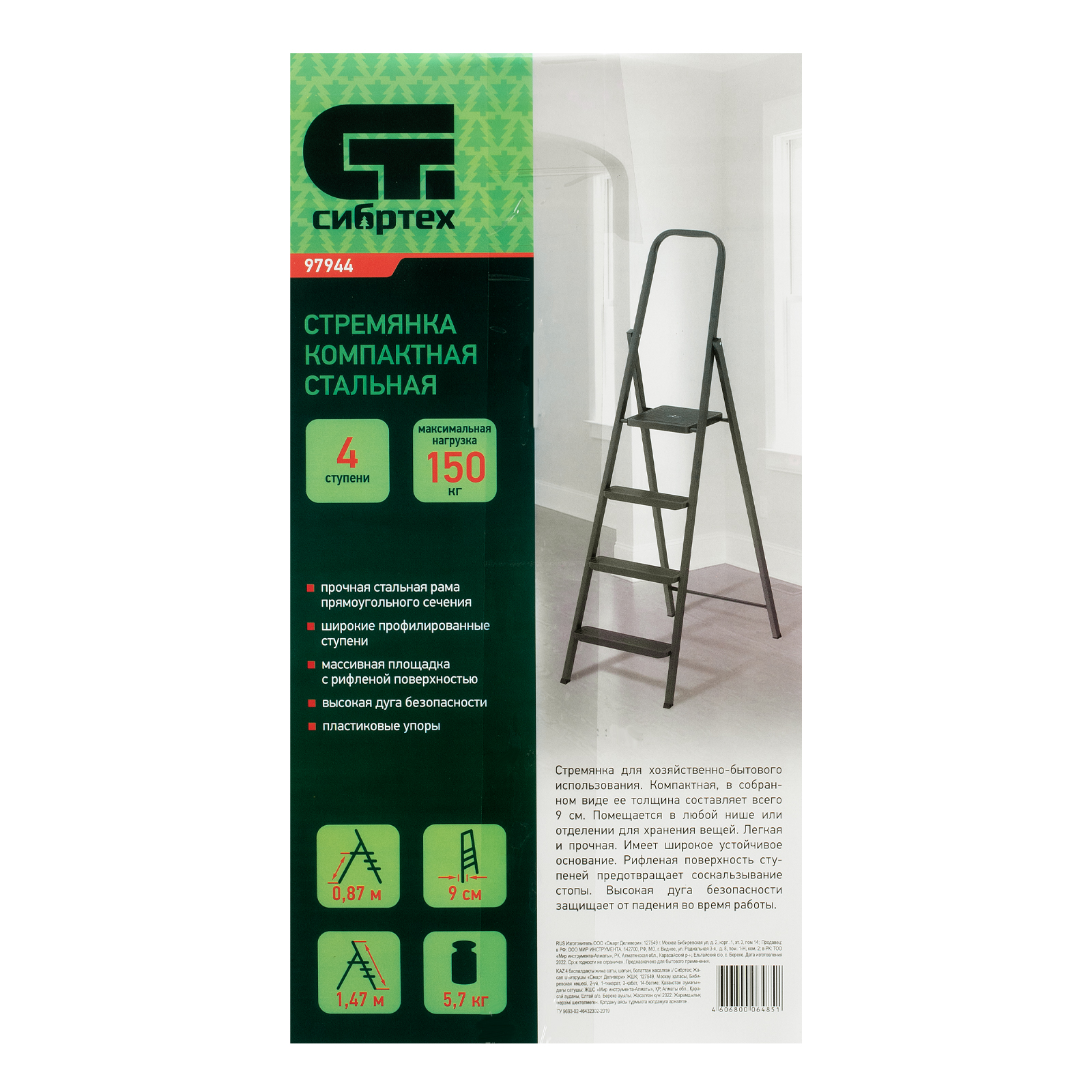 ПроизводителиЛестница-стремянка стальн., 4 ступ, компактная, 870мм, слож.1575х445х90мм, (97944) СИБРТЕХ