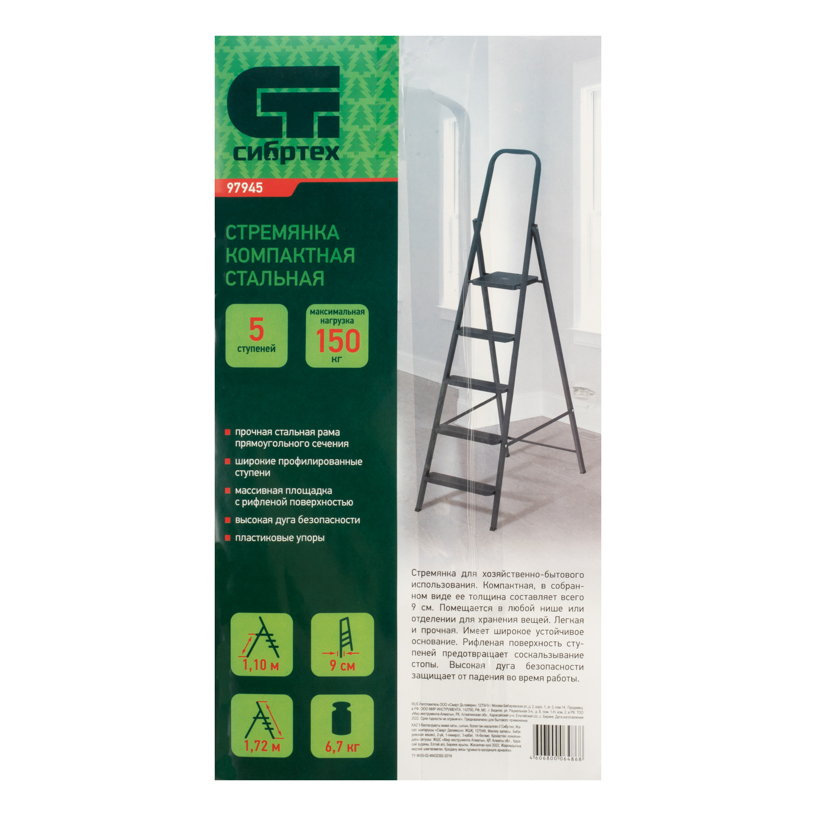 ПроизводителиЛестница-стремянка стальн., 5, ступ, компактная, 1100мм, 1820х475х90мм, (97945) СИБРТЕХ