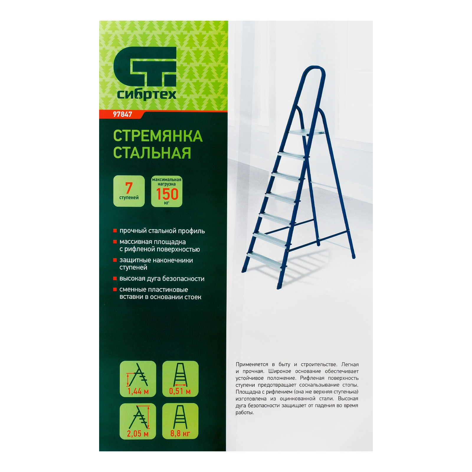 ПроизводителиЛестница-стремянка стальн., 7 ступ, 1425мм, слож.2220х500х105мм, (97847) СИБРТЕХ