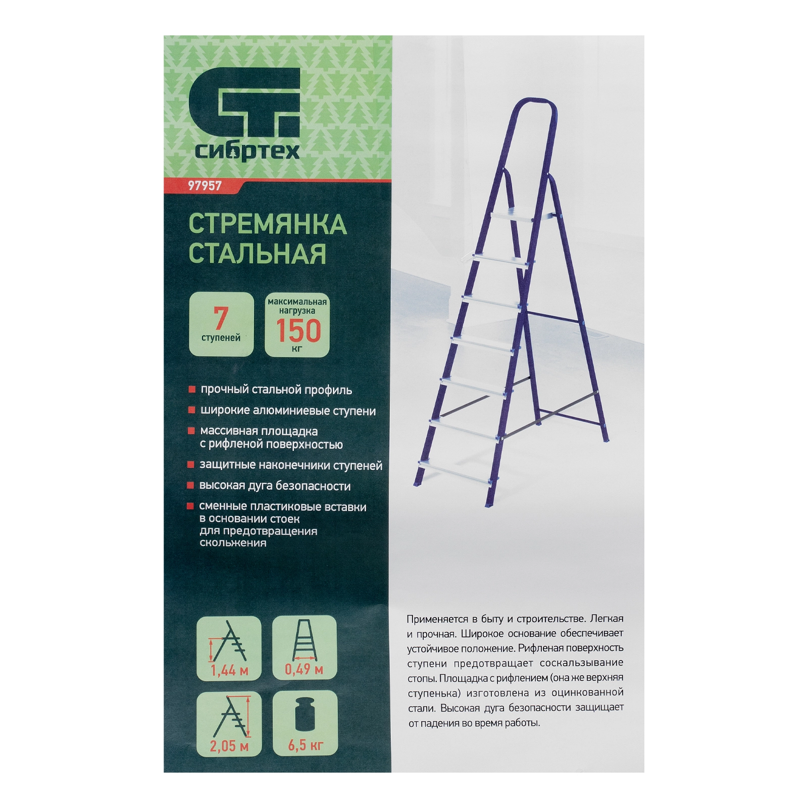 ХарактеристикиАртикул 97957Бренды СИБРТЕХСтрана производства РоссияВысота до площадки, м 1.43Высота рабочая, м 3.43Макс. нагрузка, кг 150Количество ступеней 7Используется в быту: дом, сад, гараж, а так же коммунальной и строительной деятельности.
