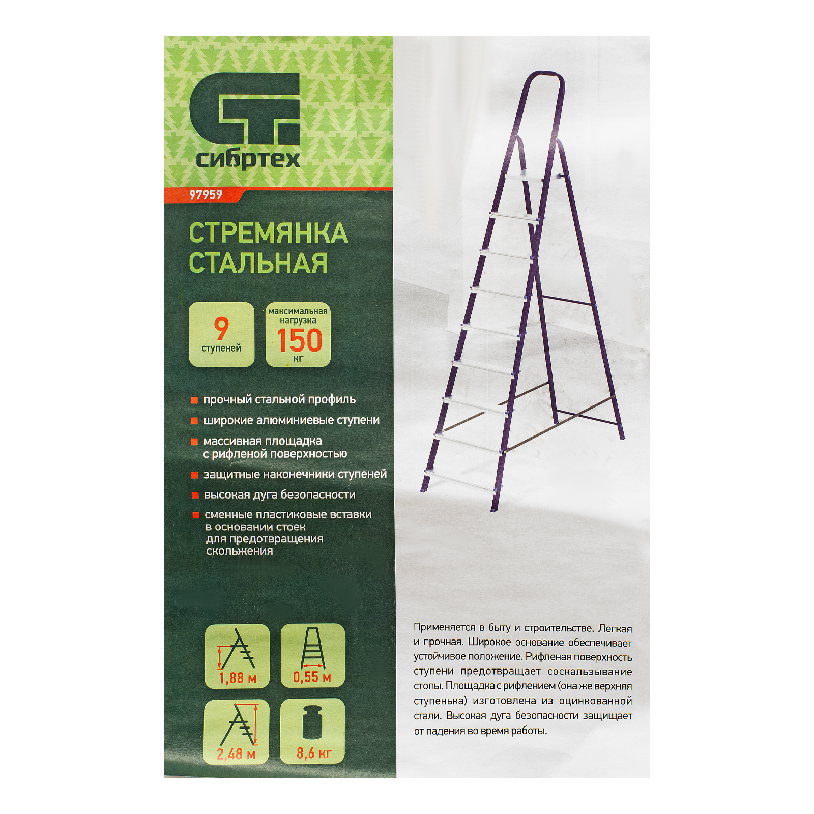 ХарактеристикиАртикул 97959Бренды СИБРТЕХСтрана производства РоссияВысота до площадки, м 1.85Высота рабочая, м 3.85Макс. нагрузка, кг 150Количество ступеней 9Используется в быту: дом, сад, гараж, а так же коммунальной и строительной деятельности.