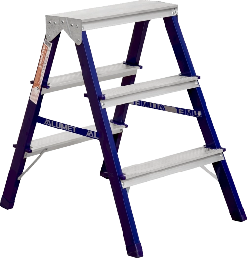 ПроизводителиЛестница-стремянка стальная двухсторонняя MD (3 ступ. 65/71см, 3.25кг) АЛЮМЕТ