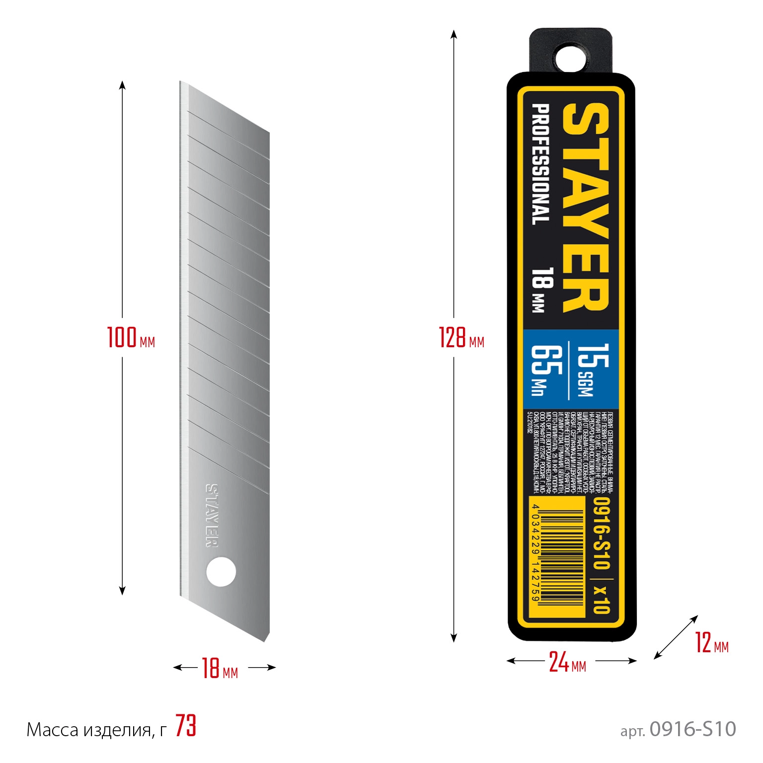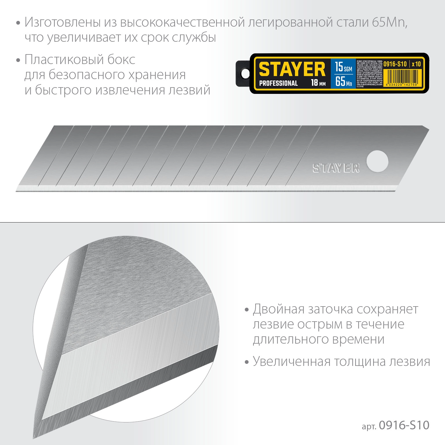 ПроизводителиЛезвие для ножа сегментированное, 18мм, 15 сегментов (10шт.) в боксе "PROFI" (0916-S10) STAYER