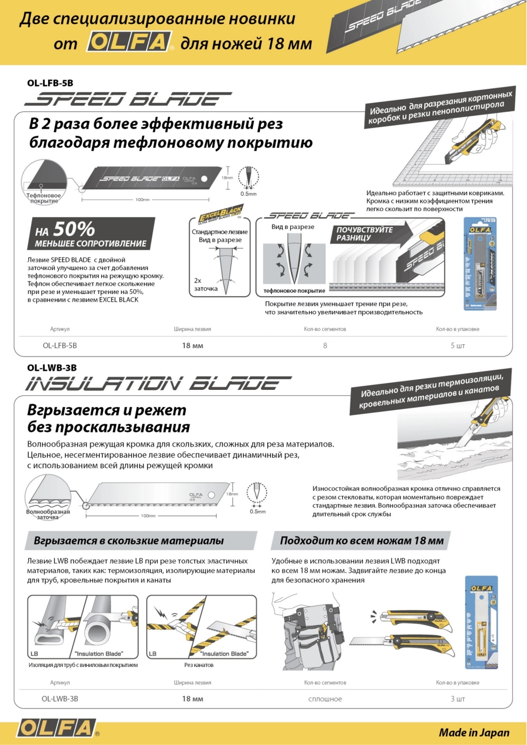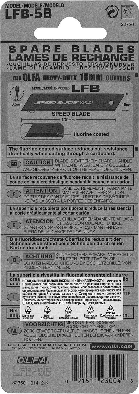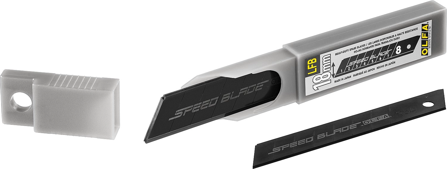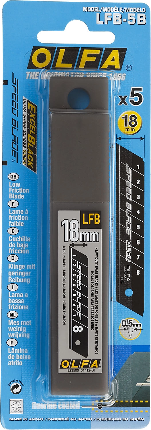 ХарактеристикиАртикул OL-LFB-5BБренды OlfaСтрана производства ЯпонияТип изделия Лезвие для ножа сегментированноеШирина, мм 18Количество штук в комплекте 5Вес 0.058Лезвие SPEED BLADE изготовлено из высококачественной японской инструментальной стали с двойной заточкой и улучшено за счет добавления тефлонового покрытия на режущую кромку. Тефлон обеспечивает легкое скольжение при резе и уменьшает трение на 50% в сравнении с лезвиями серии EXCEL BLACK. Лезвия упакованы в удобный кейс для переноски и хранения.