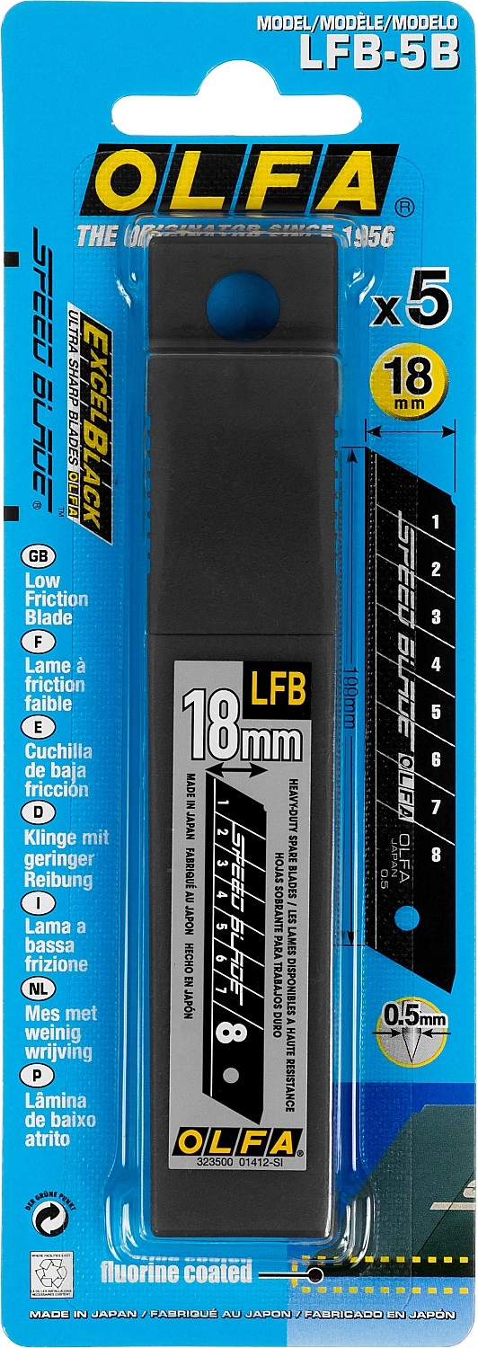 ПроизводителиЛезвие для ножа сегментированное 18мм (5шт.), тефлоновое покрытие, в боксе (OL-LFB-5B) OLFA