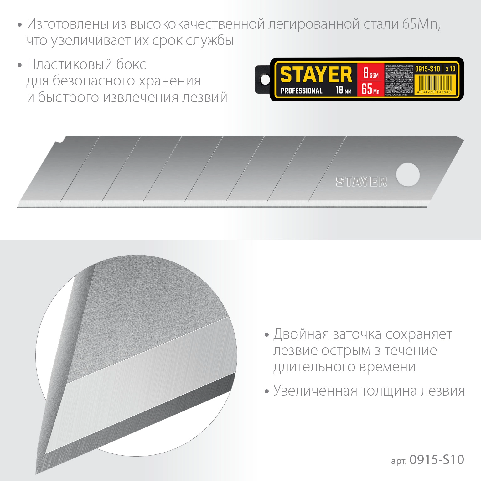 ПроизводителиЛезвие для ножа сегментированное 18мм (10шт.), в боксе (0915-S10) STAYER