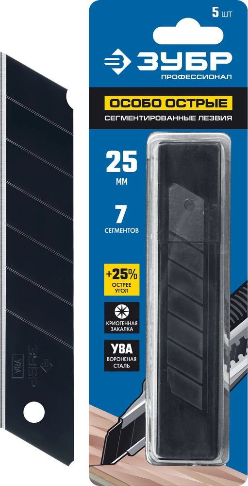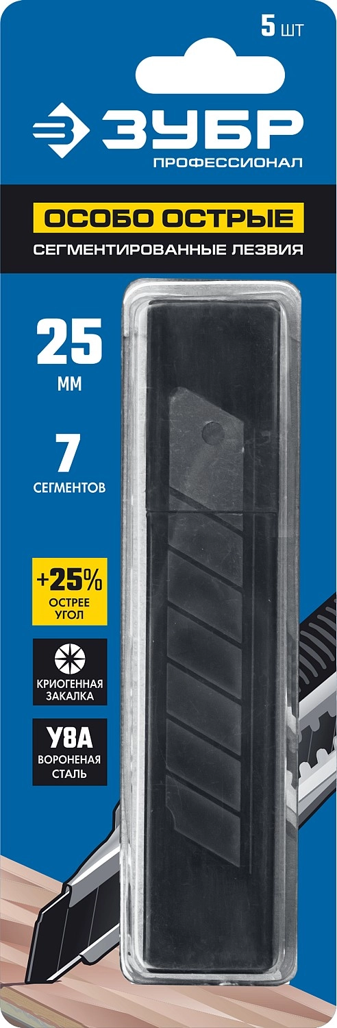 ПроизводителиЛезвие для ножа сегментированное 25мм (5шт.), особоострые, вороненые (09715-25-5) ЗУБР