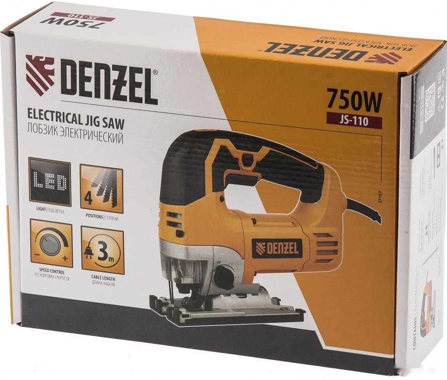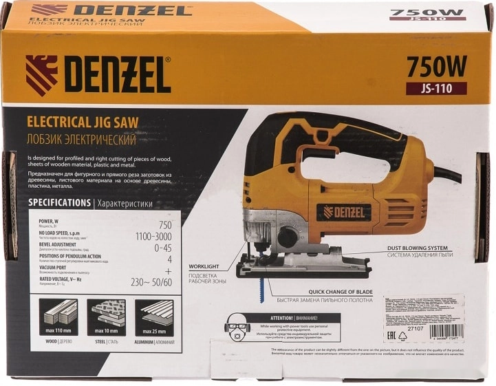 ХарактеристикиАртикул 27107Бренды DENZELСтрана производства КитайПодсветка рабочей зоны естьВес 3.52Питание сетьТип корпуса рукоятка-скобаМощность 750Глубина пропила (дерево) 110Глубина пропила (сталь) 10Глубина пропила (цветные металлы) 25Частота ходов 3000Режим маятникого хода естьРегулировка частоты хода естьАвтоматический сдув опилок естьПодключение к пылесосу естьСистема быстрой замены пилок естьЛазерный маркер нетКоличество пилок 2Кейс нетКомплектации ключЗащита от непреднамеренного включения ДаОписание набора Лобзик электрический ручной; - Пилка для дерева; - Пилка для металла; - Шестигранный ключ; - Направляющая; - Адаптер для подключения пылесоса; - Комплект запасных угольных щеток; - Инструкция по эксплуатации и гарантийный талон.Защитный щиток ДаРегулировка оборотов ДаОписание товара обновлено 28.01.2026 16:49:25Штрихкод (EAN-13): 4044996172477